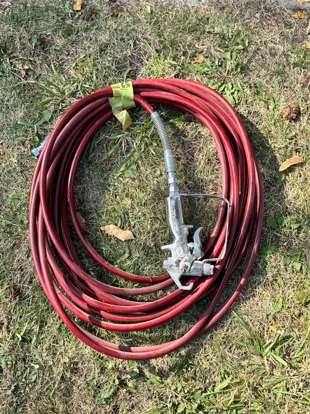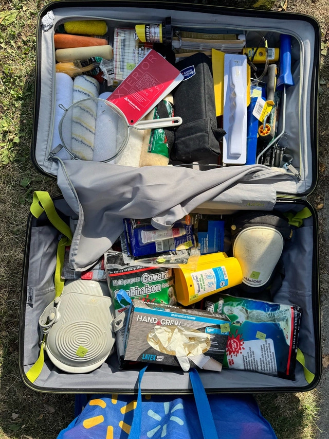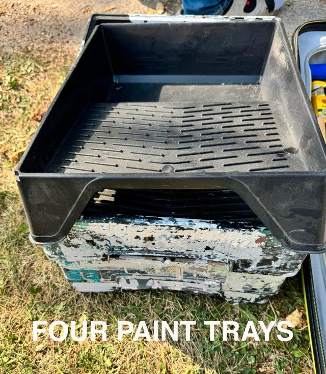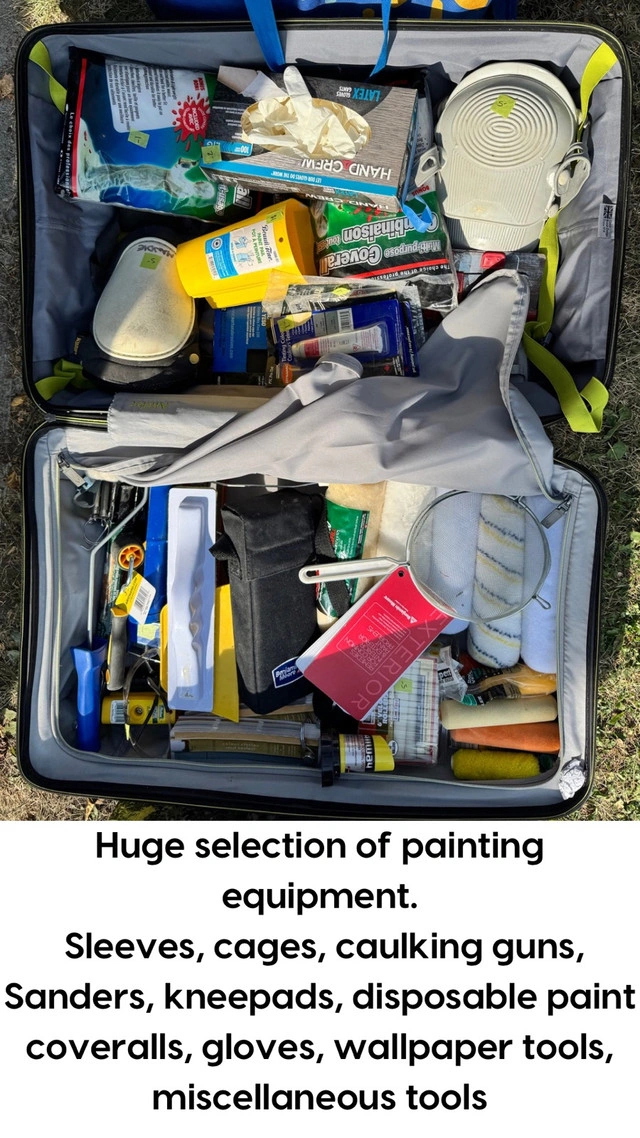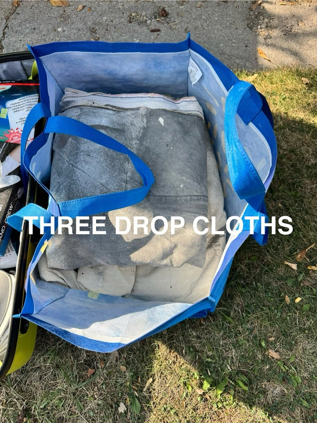 77Thinning out my paint supplies. Selling as a bundle. Three canvas drop cloths – two long runner types, one extra large square (large enough for a small room) One suitcase loaded with tools – see photo for details Four trays – standard size One spray hose and gun – last used for lacquer. Pick up only.