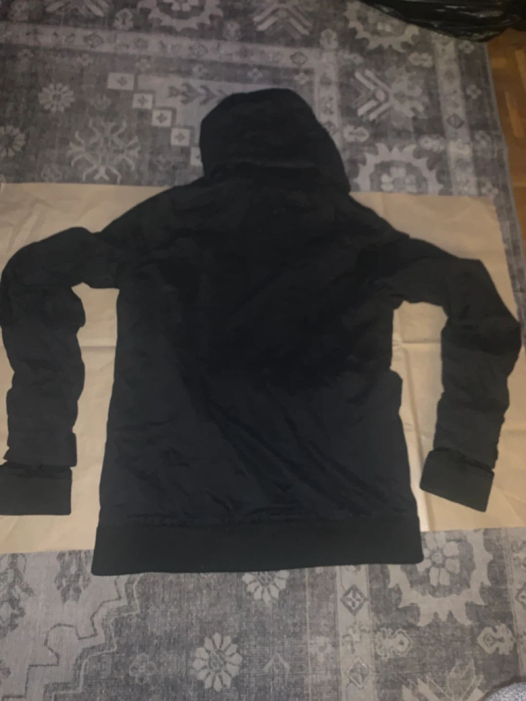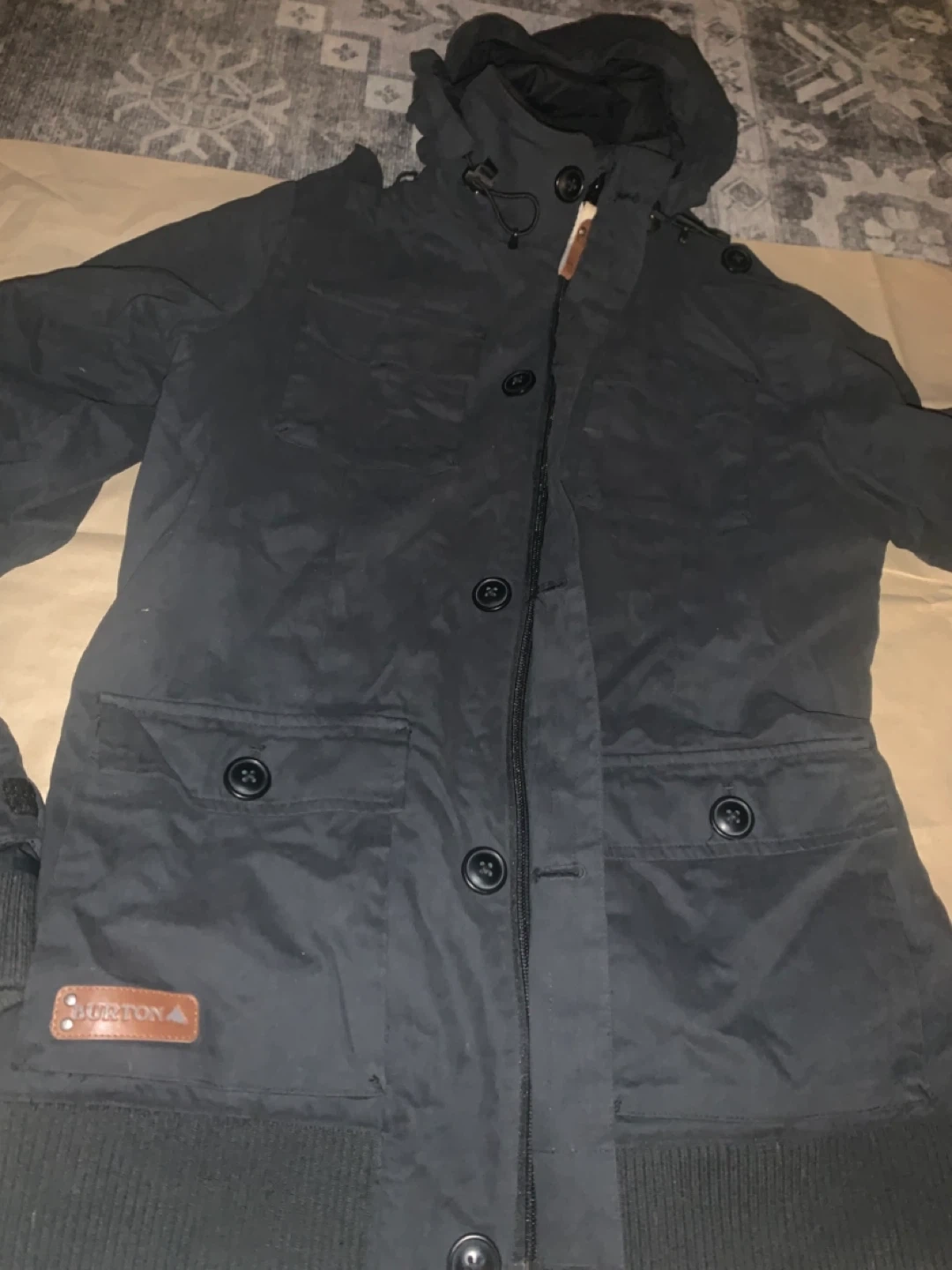 This is a black Burton snowboarding jacket for ladies. It's insulated and has a hood. Features multiple pockets and button closures. Missing one button on shoulder as seen in picture doesn’t affect the jacket.