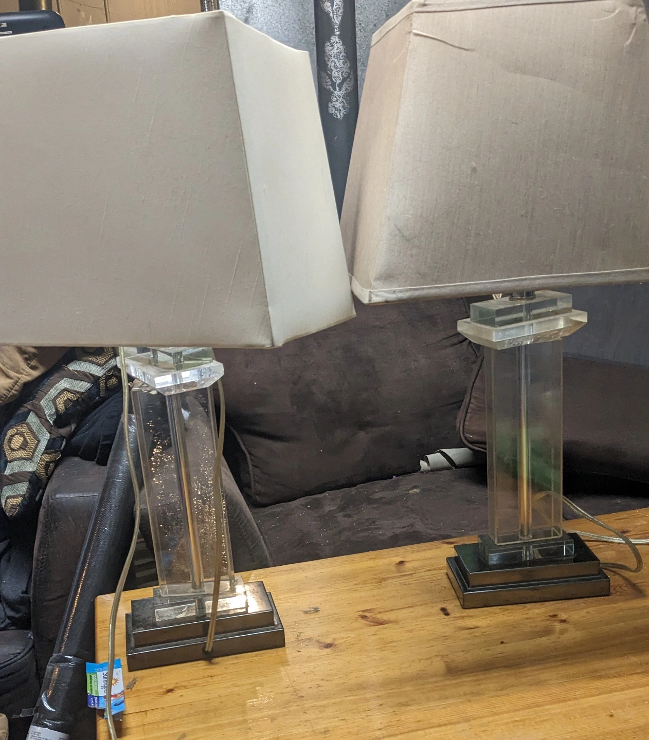 Set of two modern table lamps. Clear acrylic bases and rectangular off-white shades. Great for a contemporary setting. both for $20 or 10 each