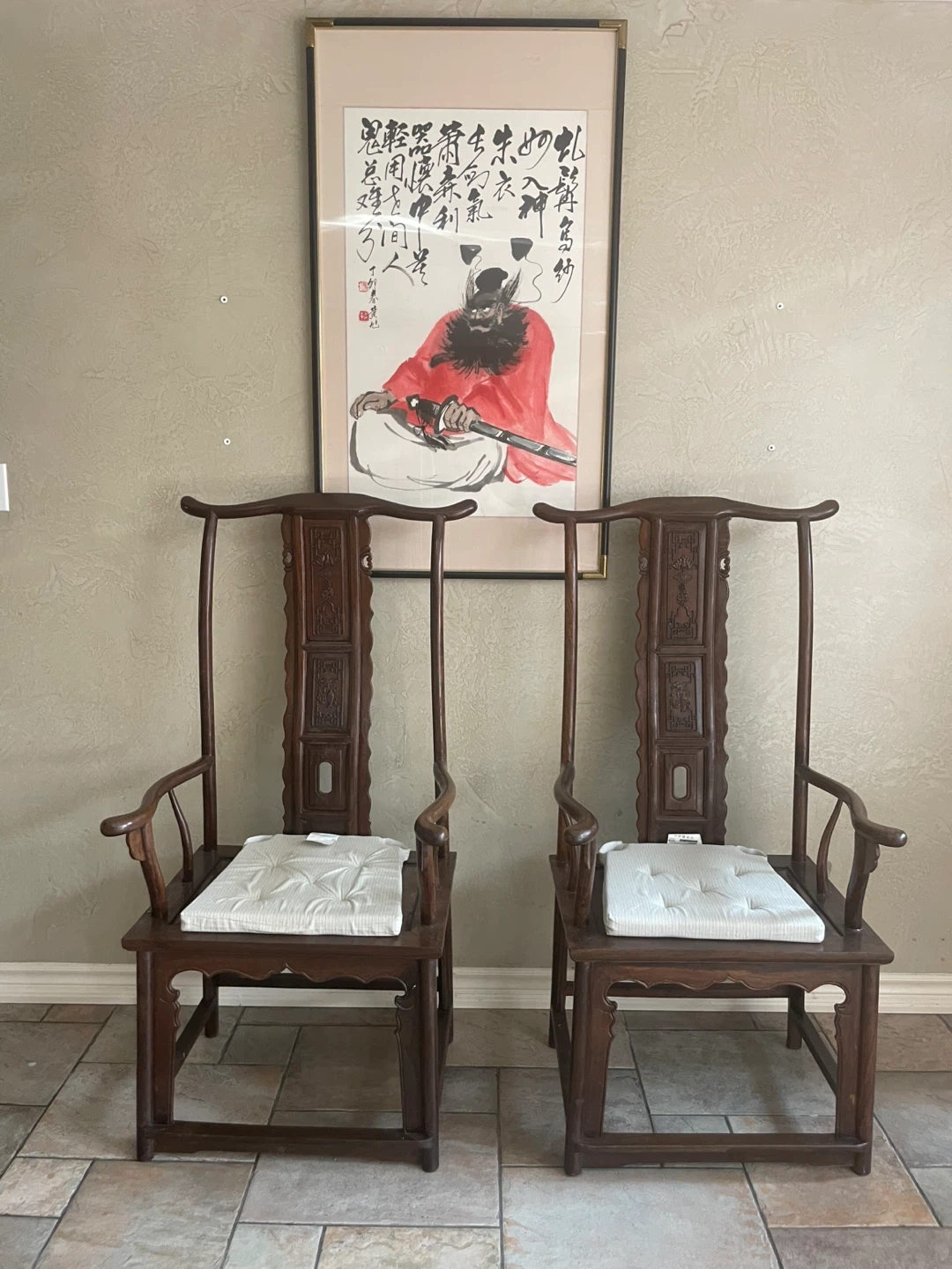 Selling a pair of beautiful antique Chinese yoke back chairs. These chairs feature intricate wood carvings and a rich, dark finish. They would make a stunning addition to any home!