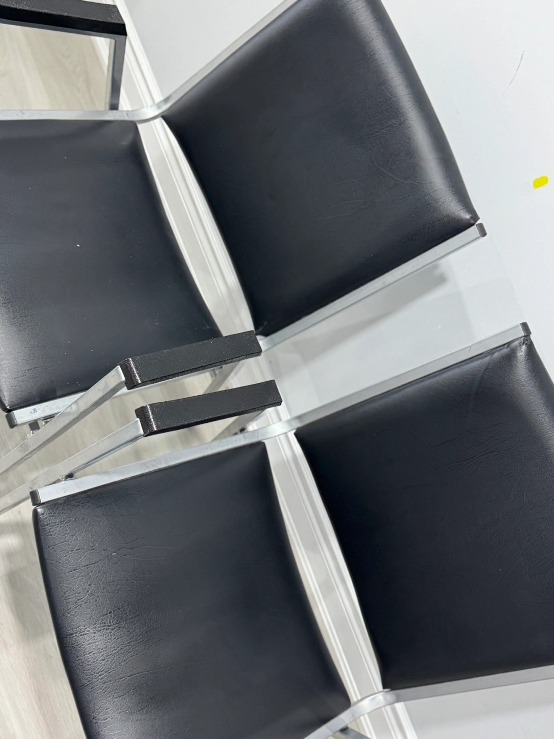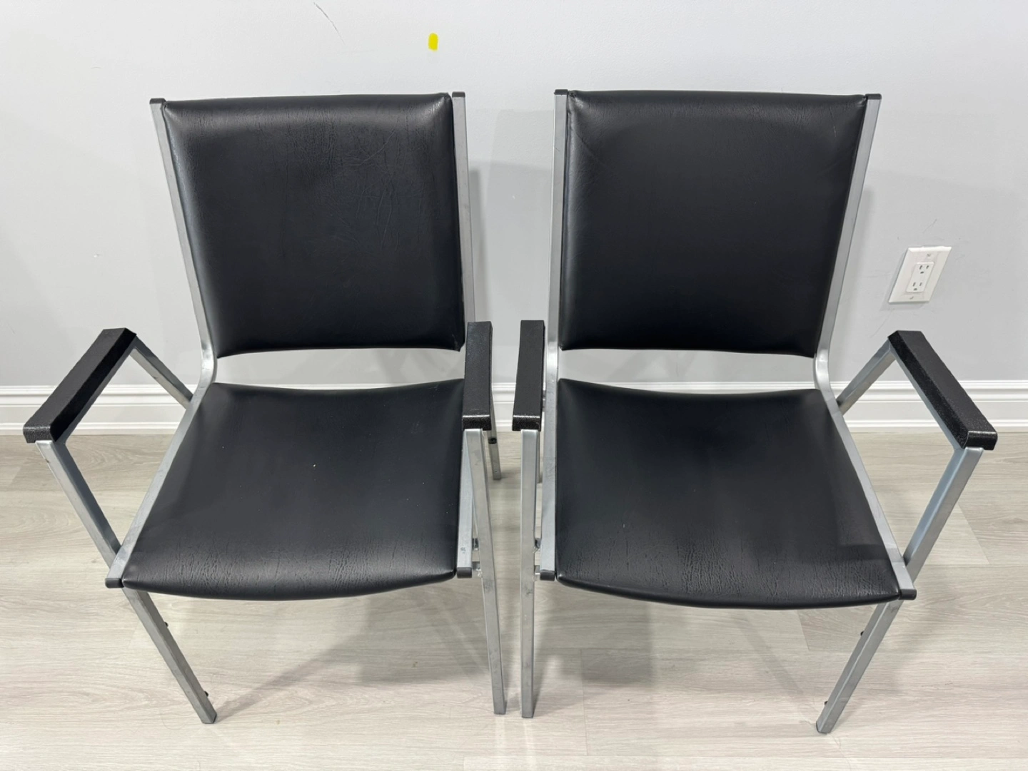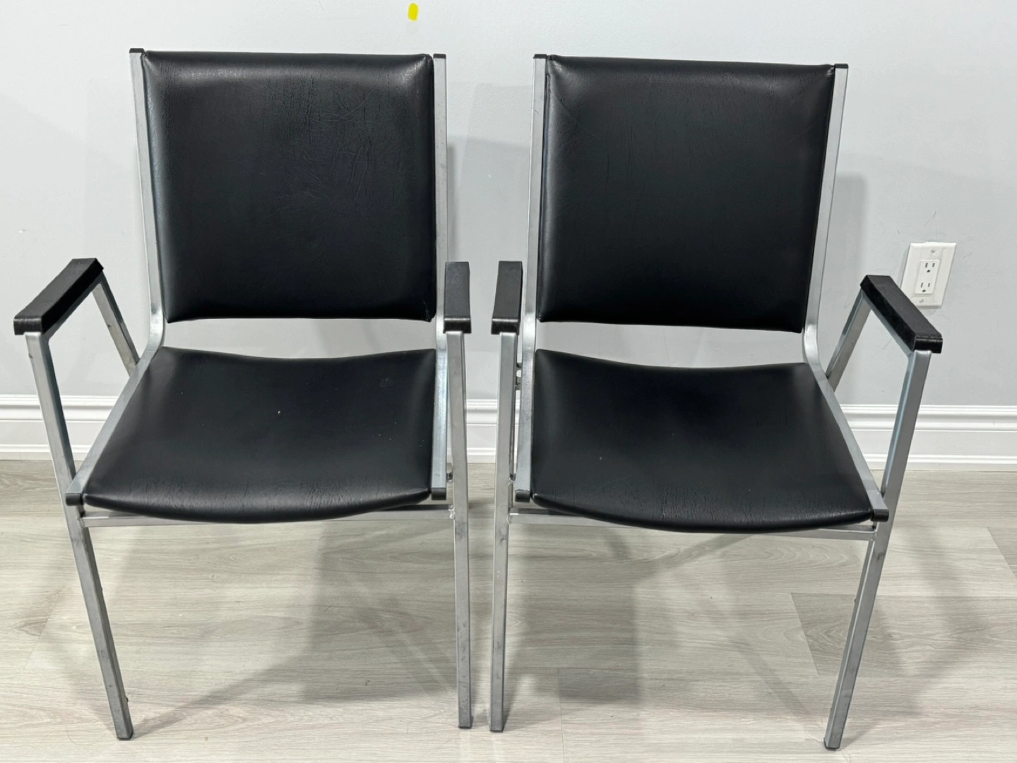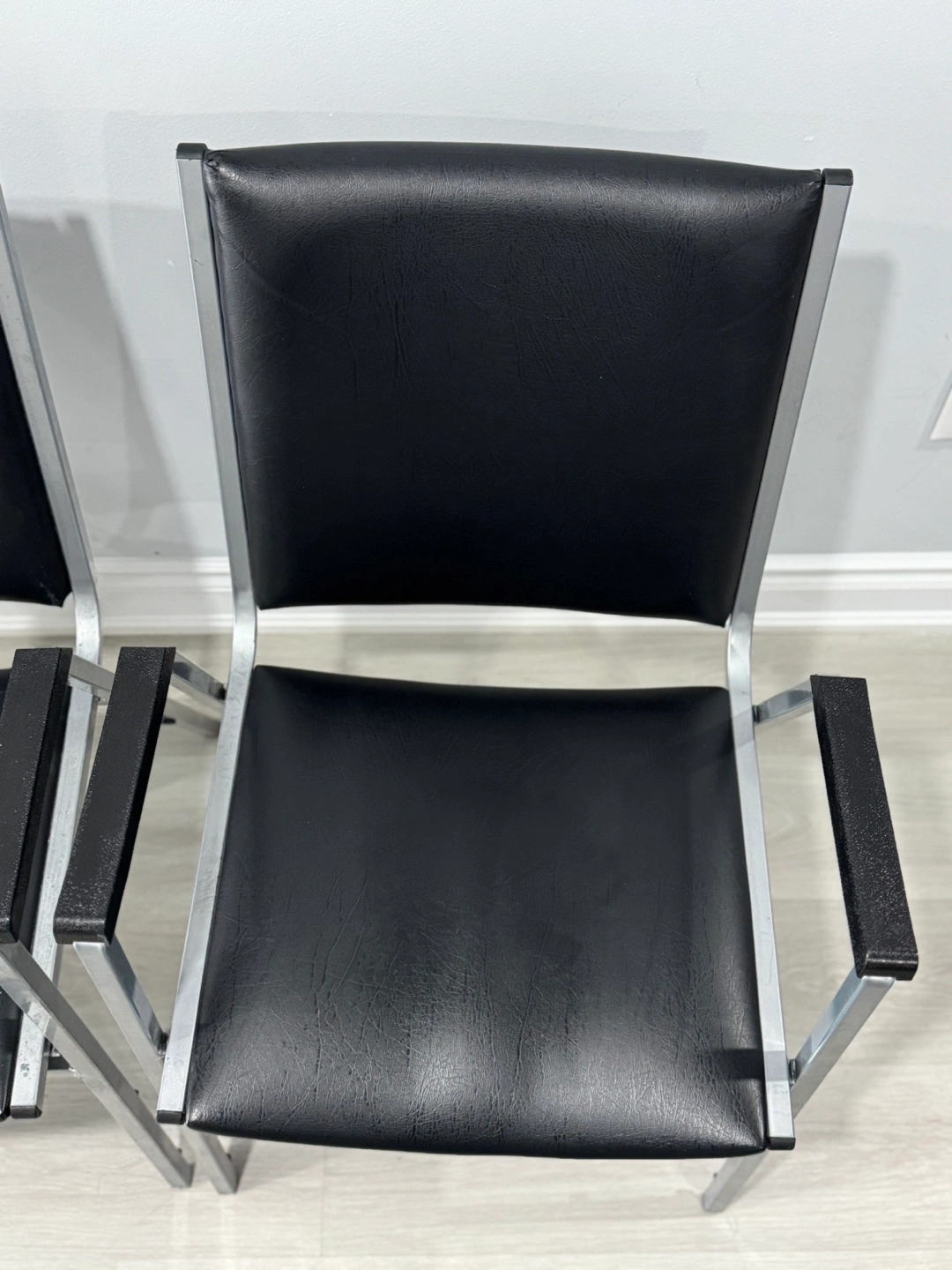 10Two vintage armchairs. Black vinyl seats and backs. Silver metal frames. Black wood armrests.