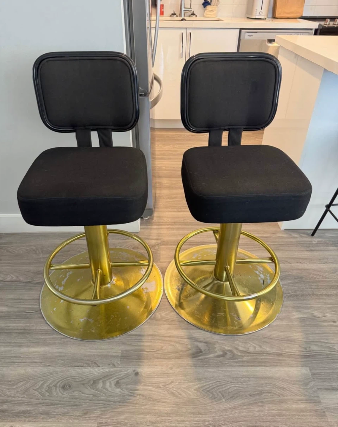 Selling a pair of bar stools with black seats (that swivel) and gold-coloured bases. The functionality is in excellent condition as well as the seats. They've got wear and tear on the bases and could use some tlc/spray paint. $75 for set These chairs are heavy and would need a vehicle pick-up. Very hard to tip if you need something sturdy!