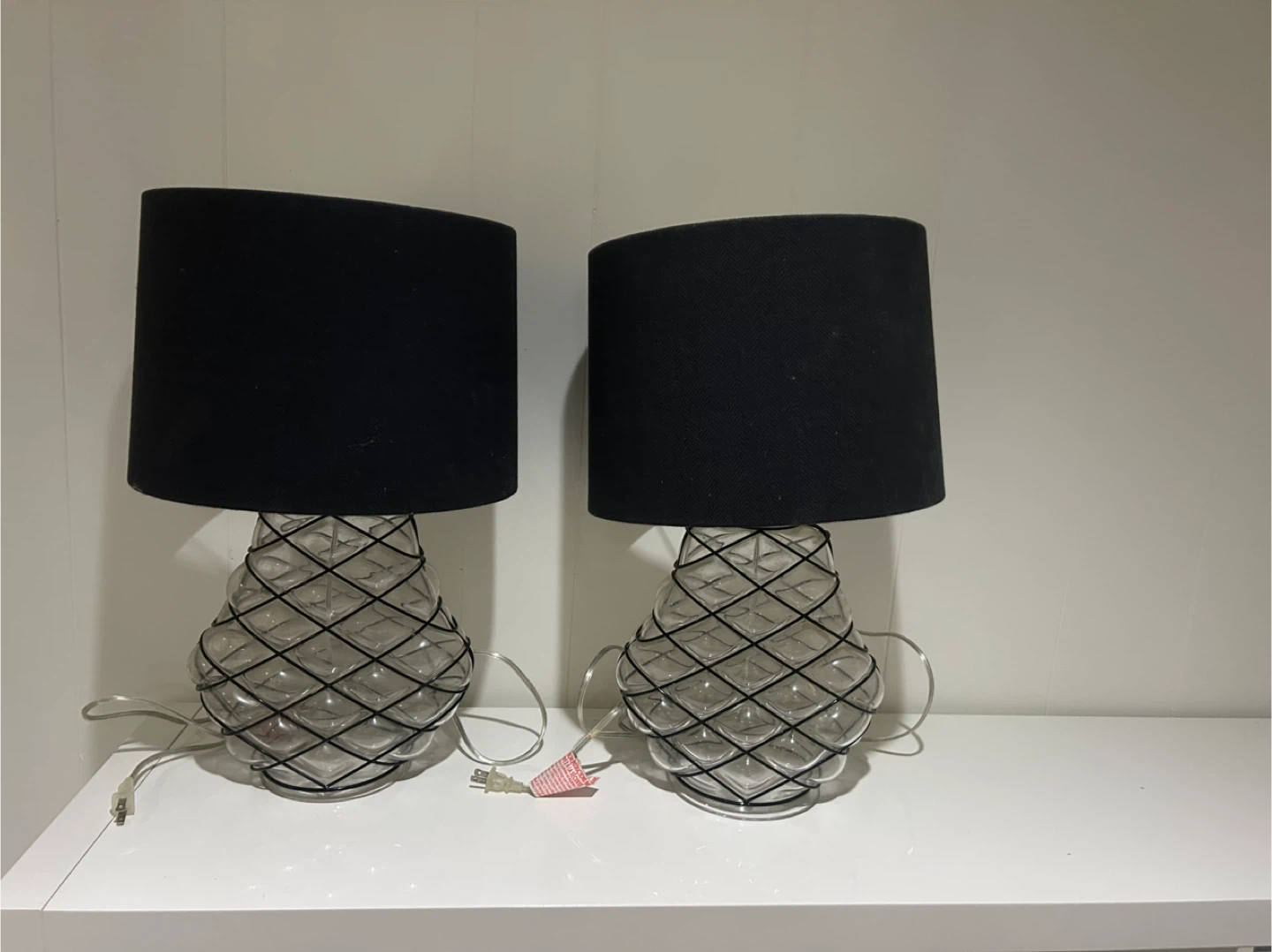 20Selling a pair of table lamps with black shades. They feature a unique glass base with a criss-cross design. Perfect for adding a touch of style to any room