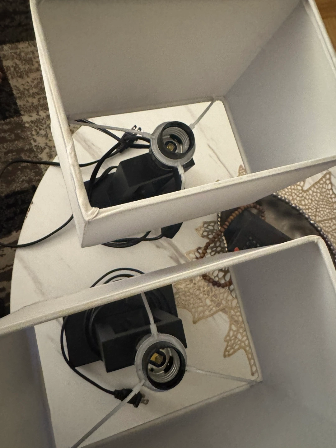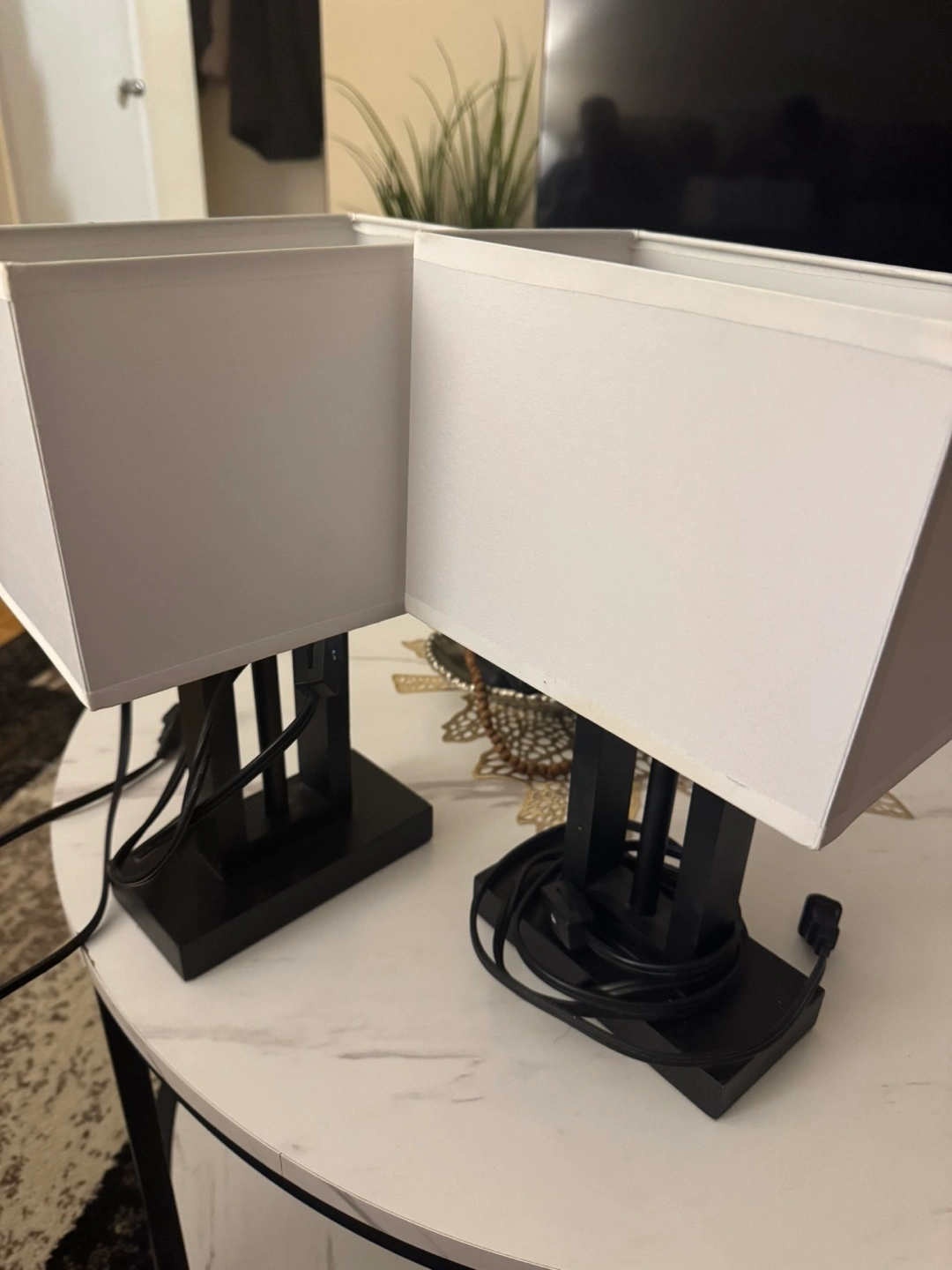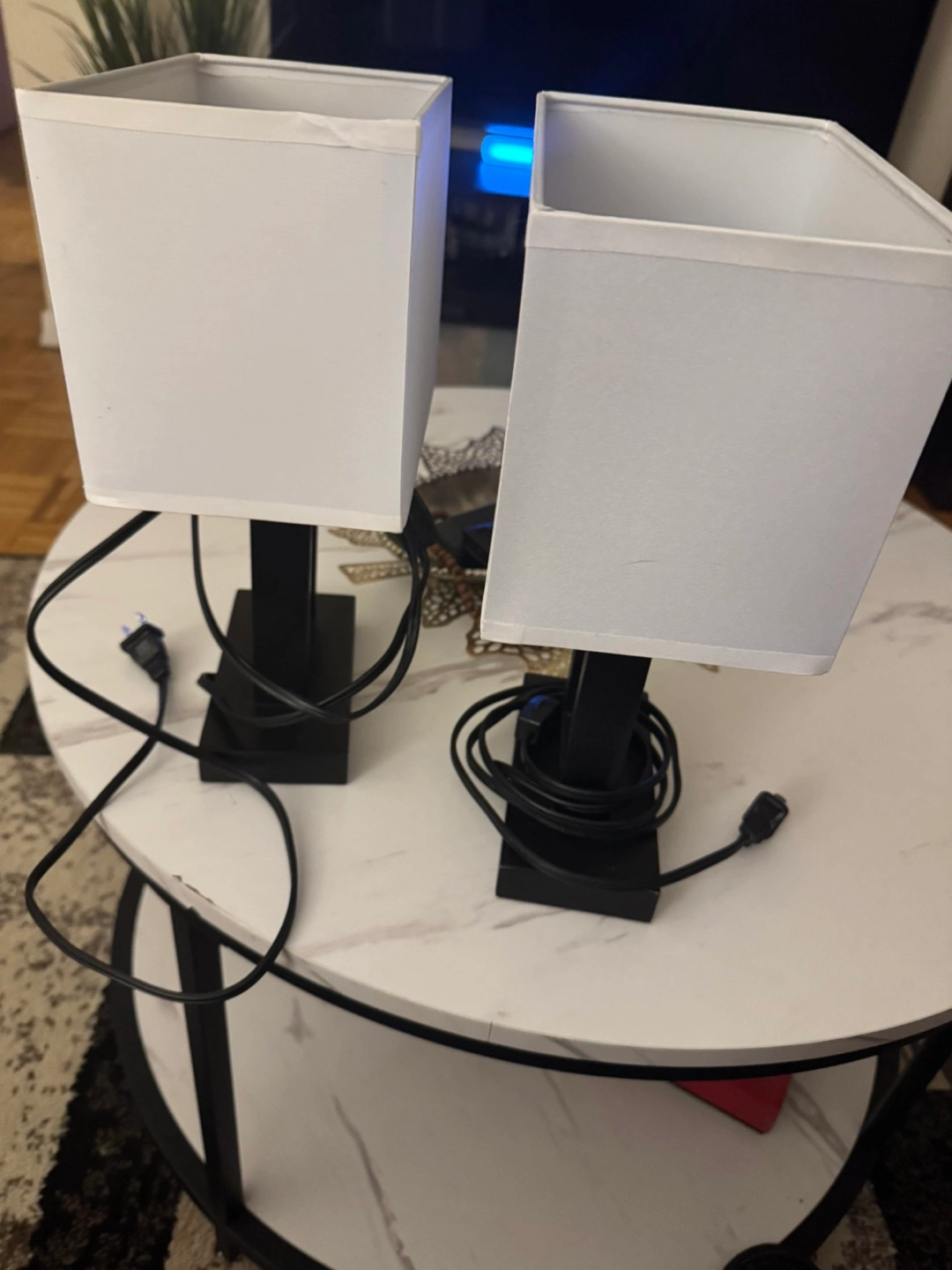 50Two matching table lamps. Black bases, simple design. White fabric shades. Electric plug-in. Great for bedside tables or as accent lighting.10 $ each
