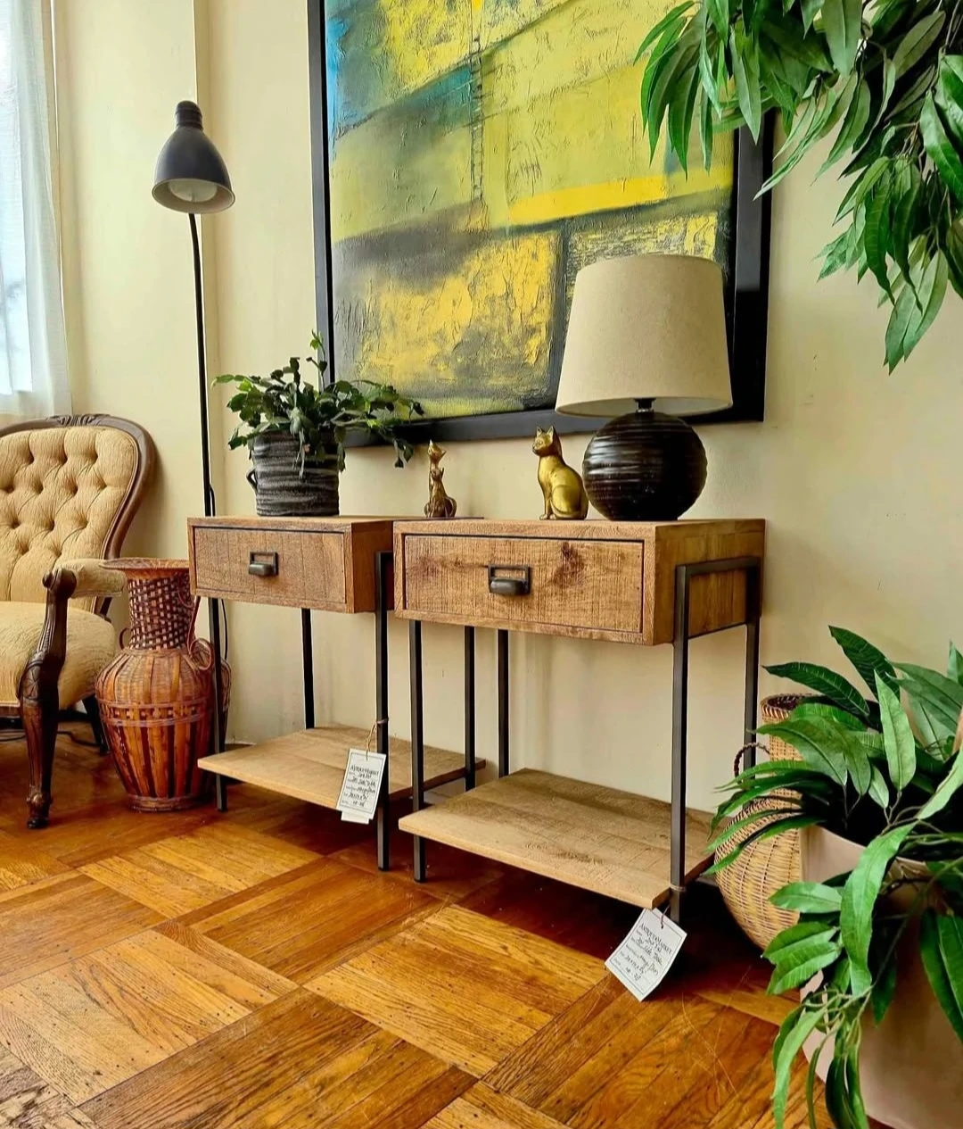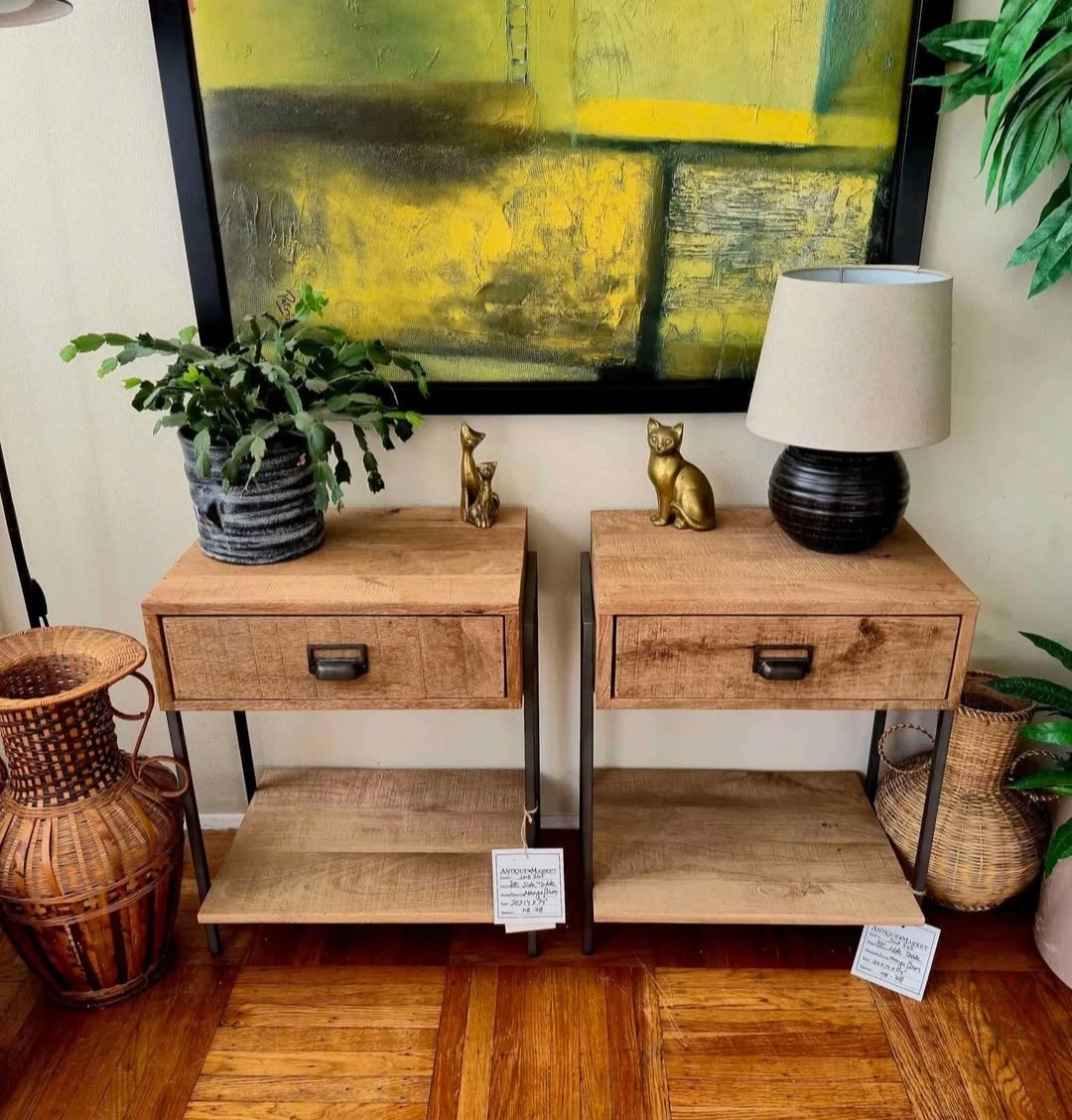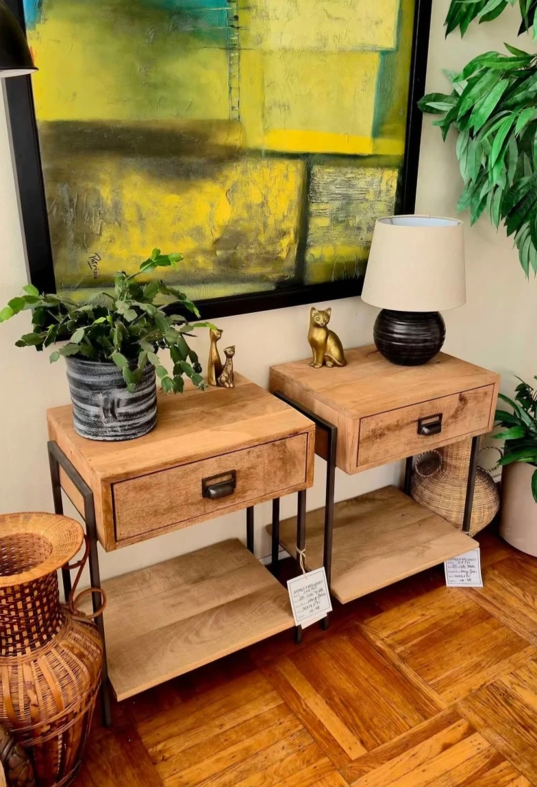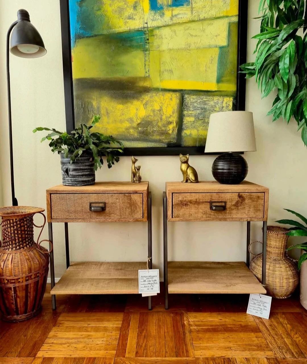 Pair Of Brand New Solid Mango Wood Nightstands (Price For Both) Selling a pair of rustic mango wood side tables! These have a single drawer and a lower shelf, perfect for adding some character to your living room or bedroom. The metal frame gives them a modern touch, while the wood keeps them warm and inviting. 18w x 13.75d x 24h all in inches Pick up in downtown Vancouver or delivery may be arranged for a reasonable fee. Priority is given to those who are able to pick up. Tags: retro vintage antique 1940s 1950s 1960s 1970s sixties mcm mid century modern furniture teak walnut cb2 eq3 west elm pottery barn crate and barrel structube article urban barn moes chest of drawers wardrobe dresser lowboy brass gold guild bedroom storage credenza sideboard server buffet side table set dec rental film westendtrends furniture film vanvaluevintage