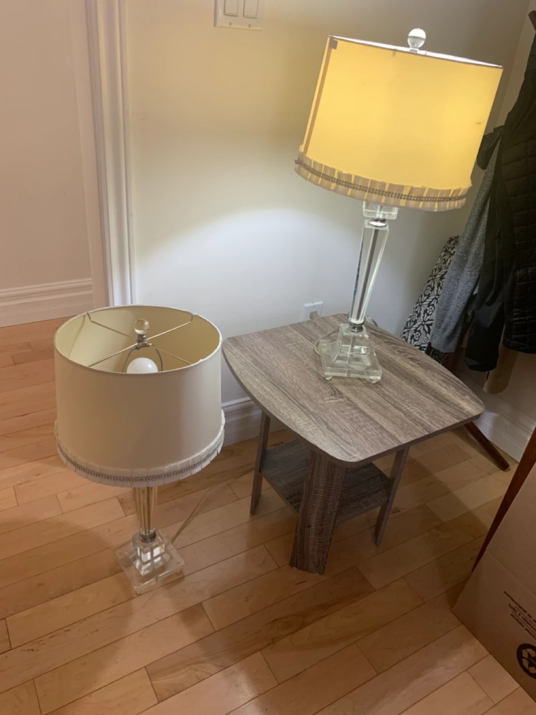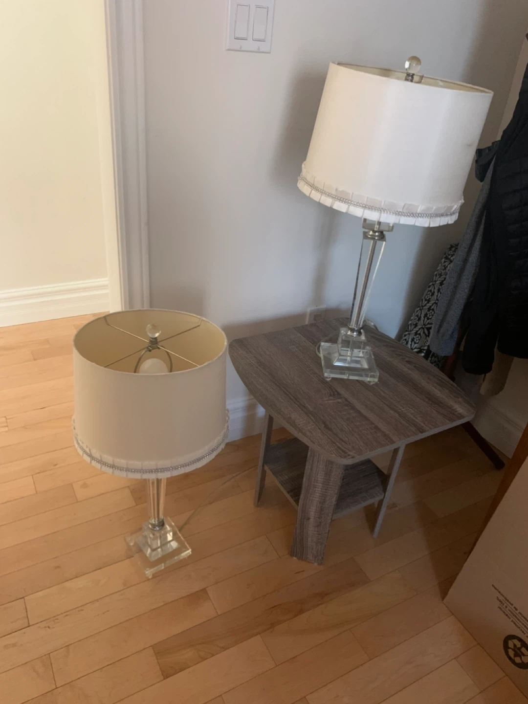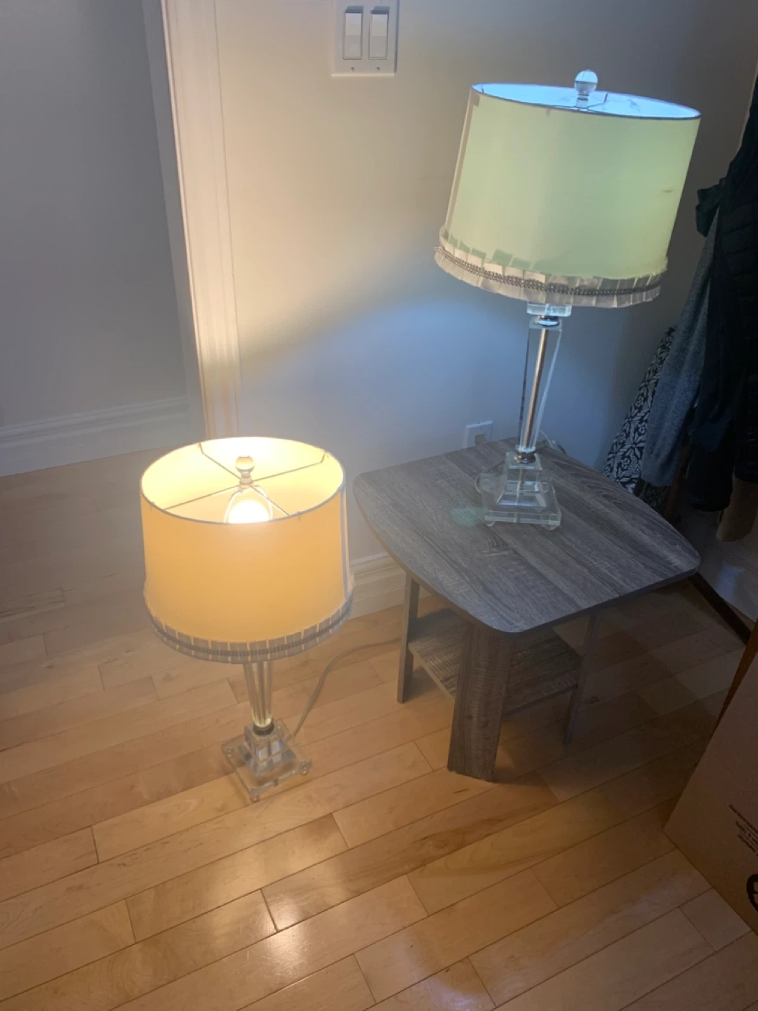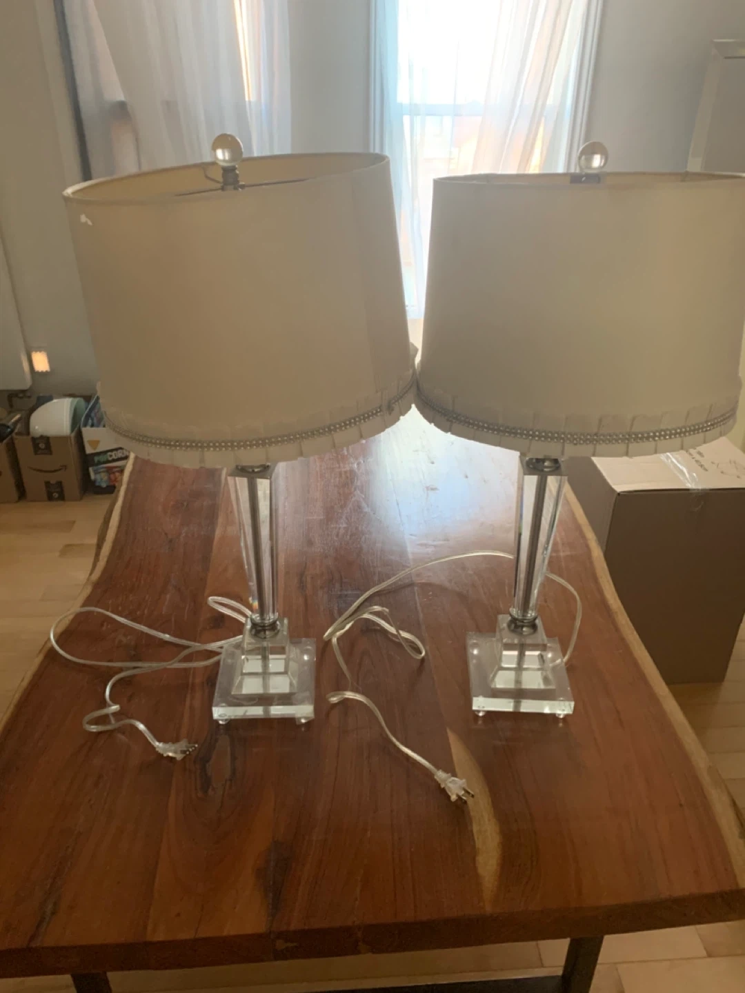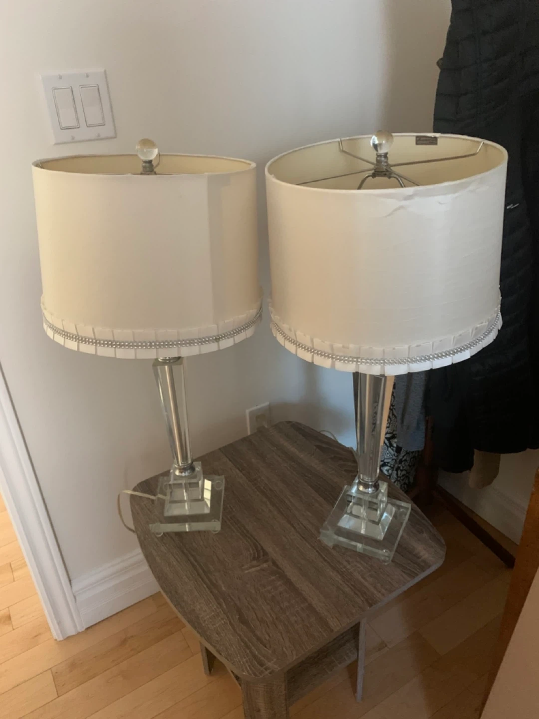 Selling a pair of lamps with crystal bases and neutral-toned shades. They're in great shape and would add a touch of elegance to any room! The shades have a delicate trim, and the bases are sturdy and stylish