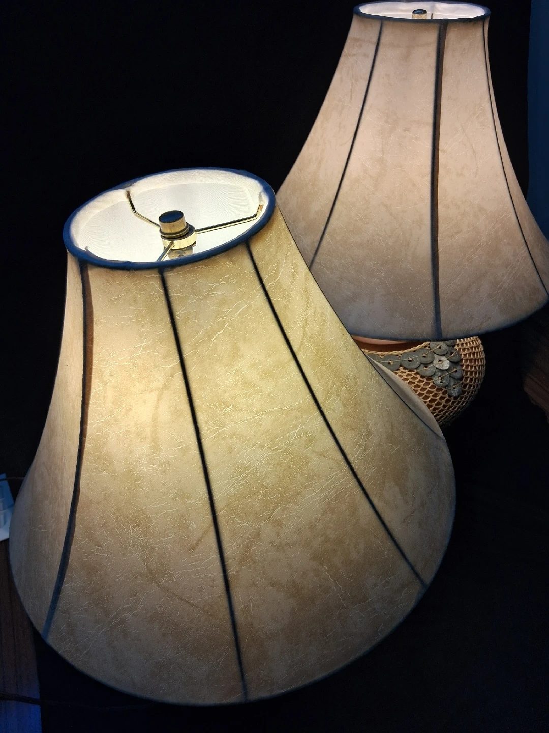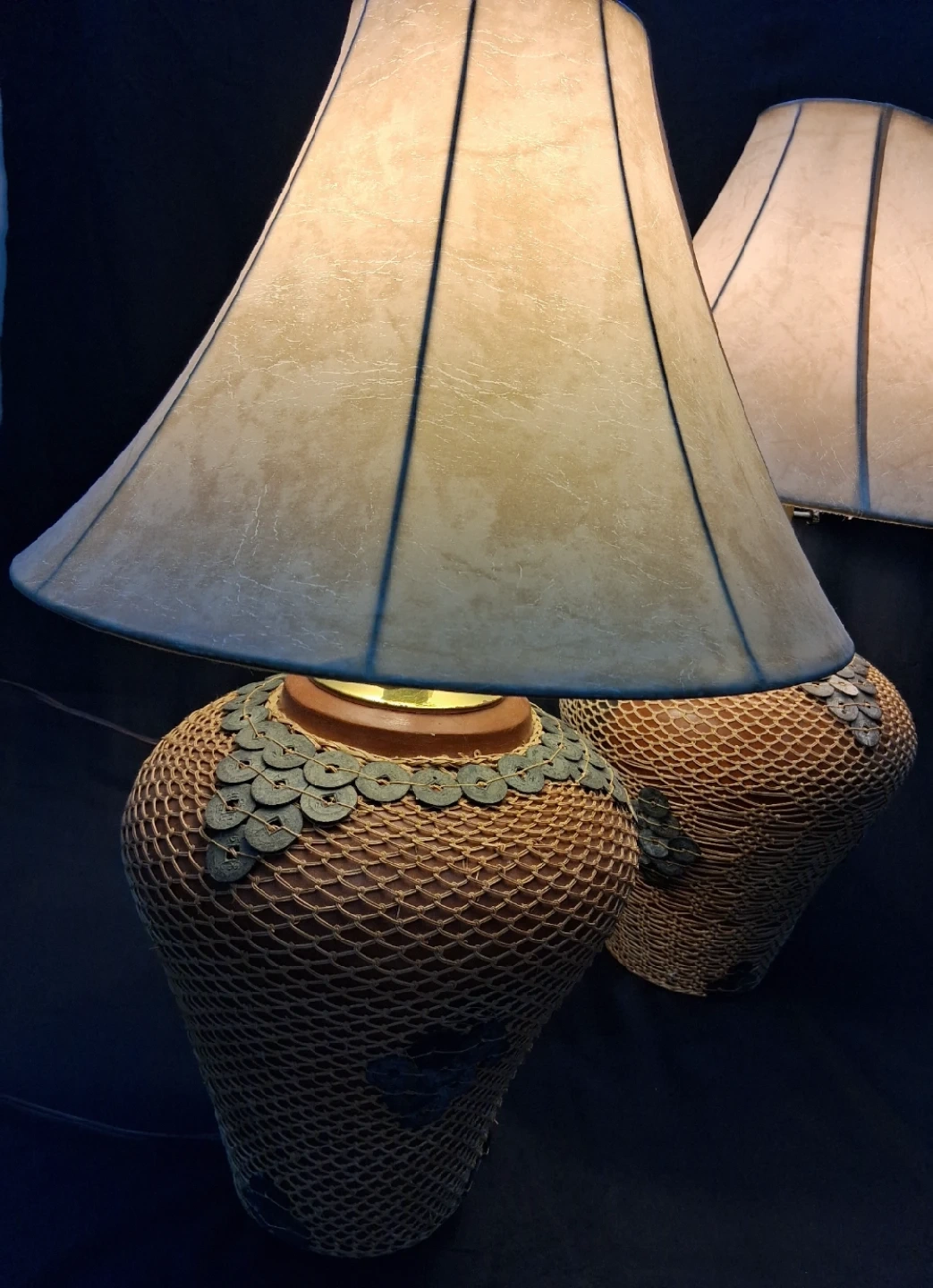 60Selling a pair of decorative lamps. They have a unique design with a woven base and a classic lampshade. These lamps would add a warm and stylish touch to any room in your home