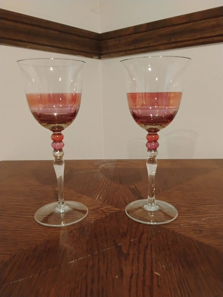 Selling a pair of beautiful wine glasses! They feature a lovely gradient of colour in the bowl and decorative beads on the stem. Perfect for adding a touch of elegance to your table setting or special occasion