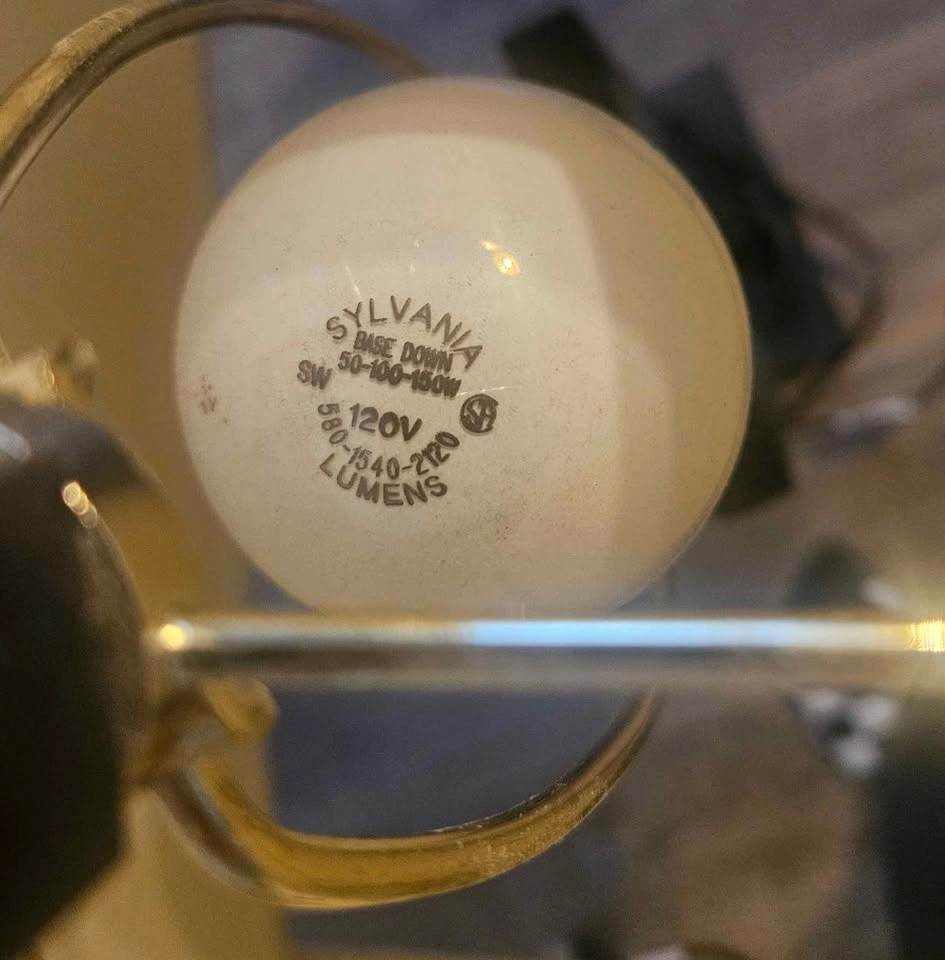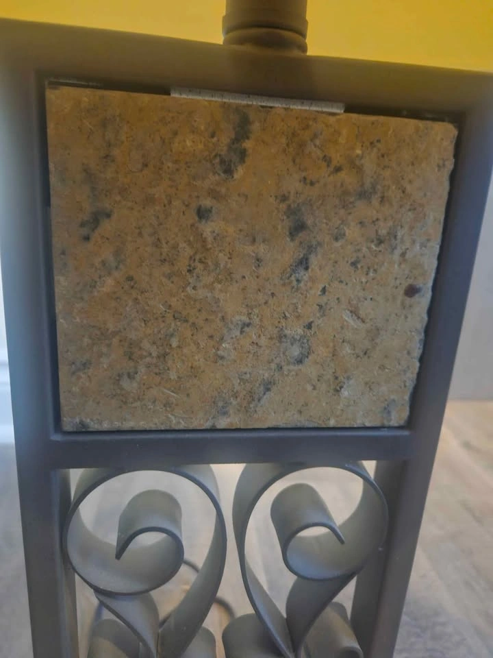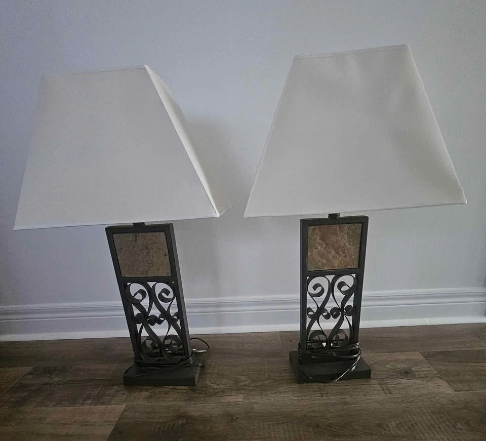 10Sold as a pair. Dark brown metal, bass with brown slate marble-look accent and off white fabric lampshades. Takes 120v tri-light bulbs Approximate Dimension: Lamp base: 17" Lampshade: 11" h x 16" w at bottom x 8" d Weight: 8 lbs each
