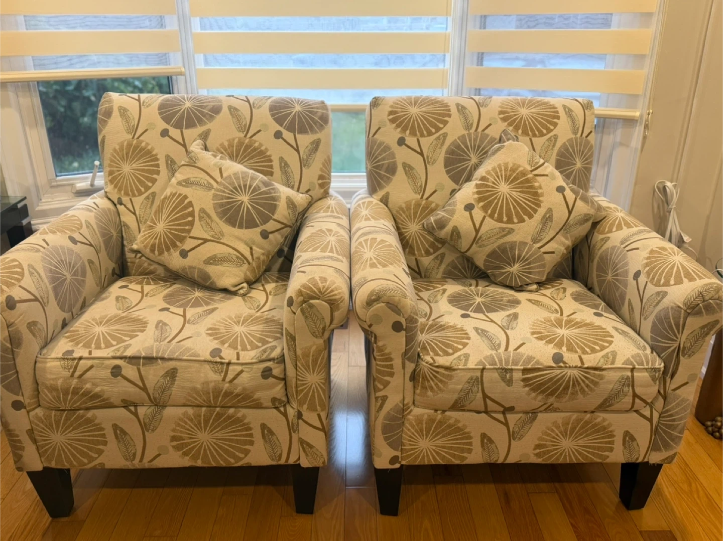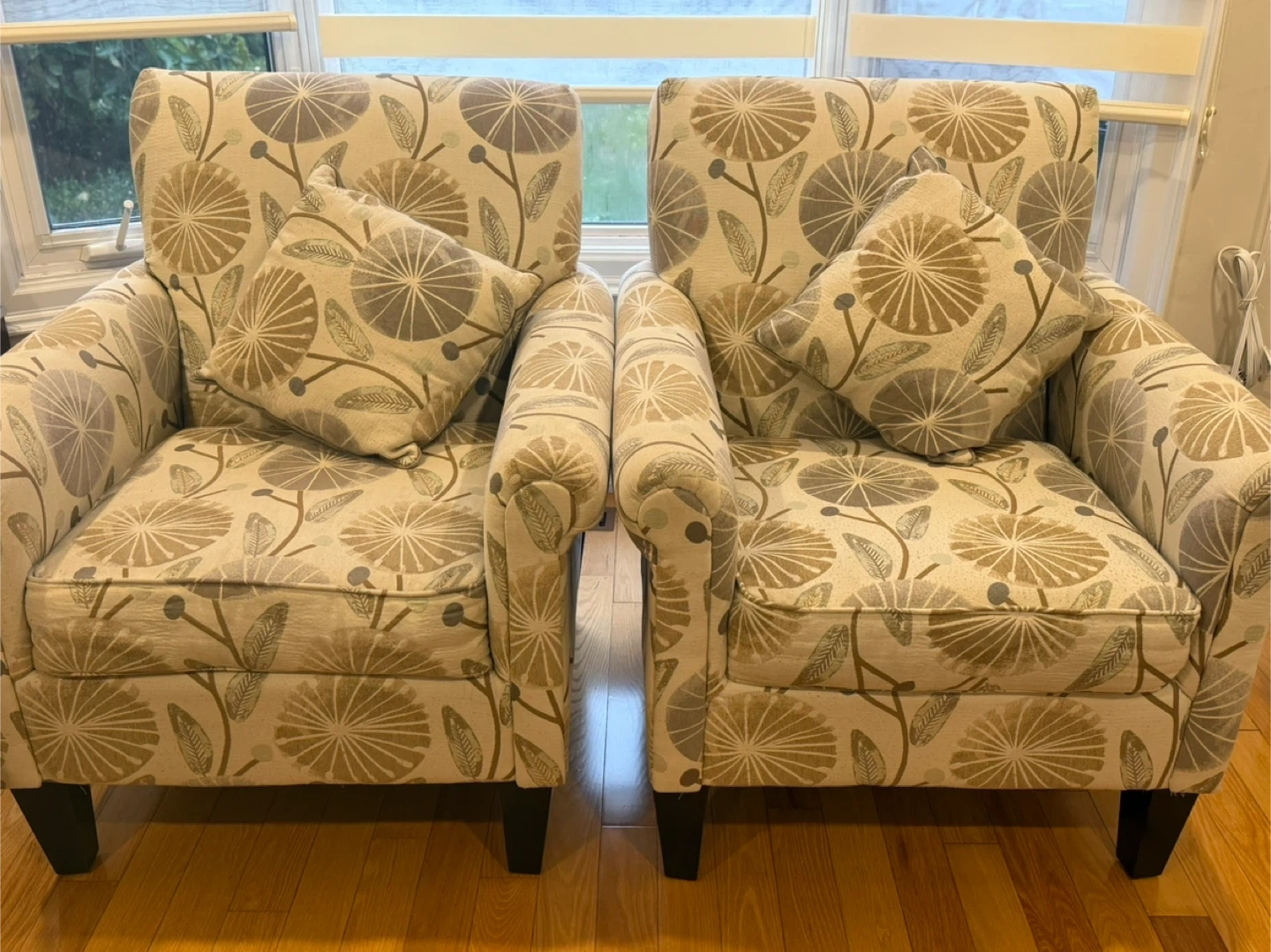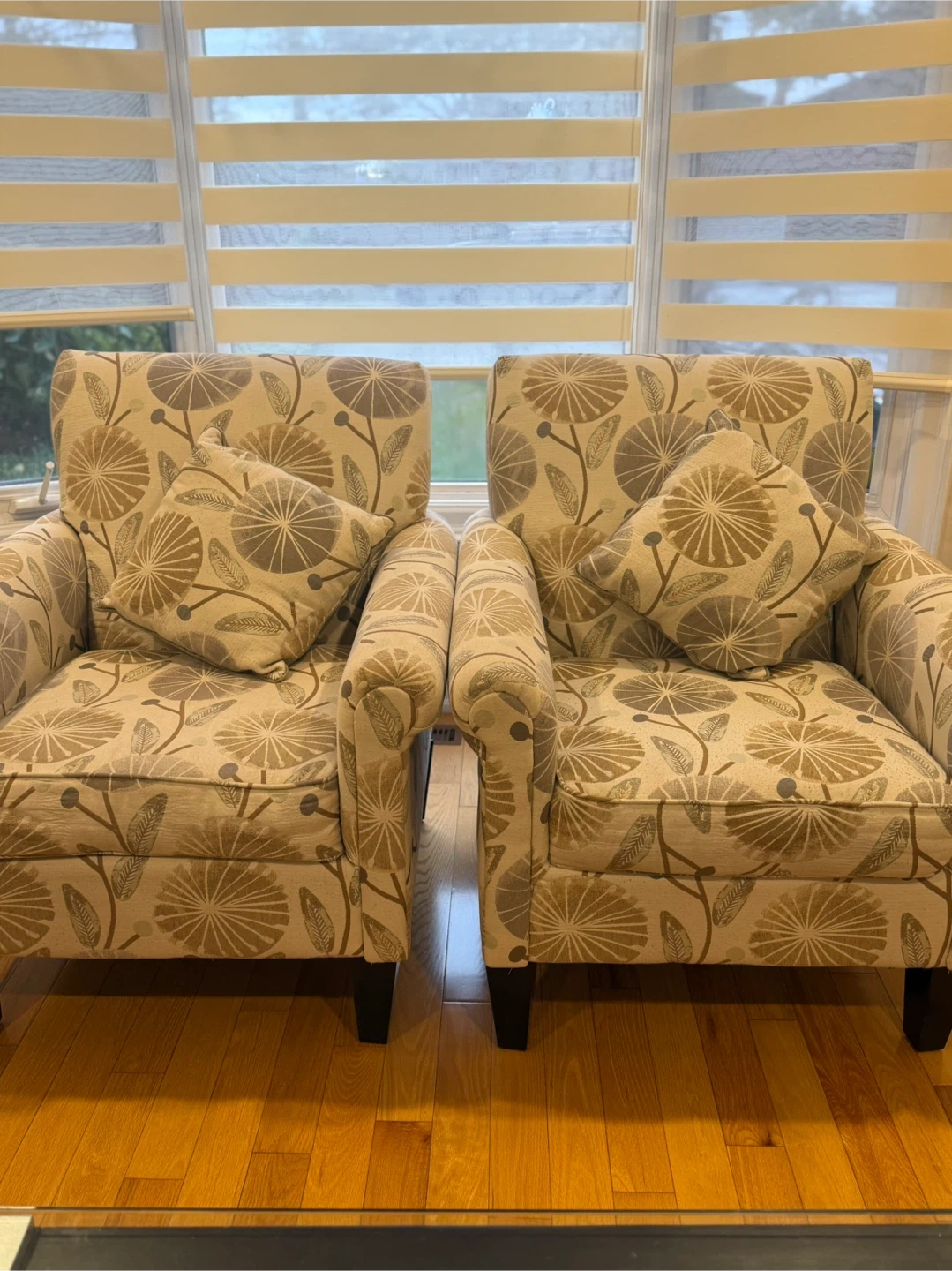 65Selling a pair of comfy armchairs featuring a lovely floral pattern! They come with matching pillows and are in great shape. Perfect for adding a touch of style to your living room or creating a cozy reading nook