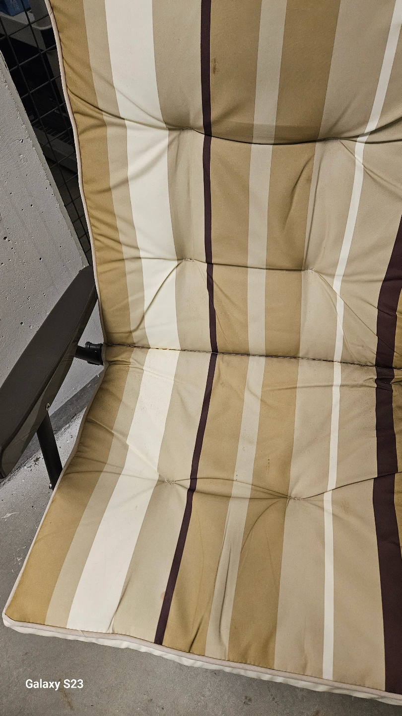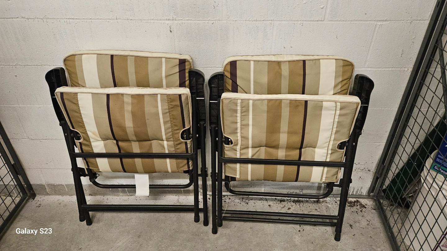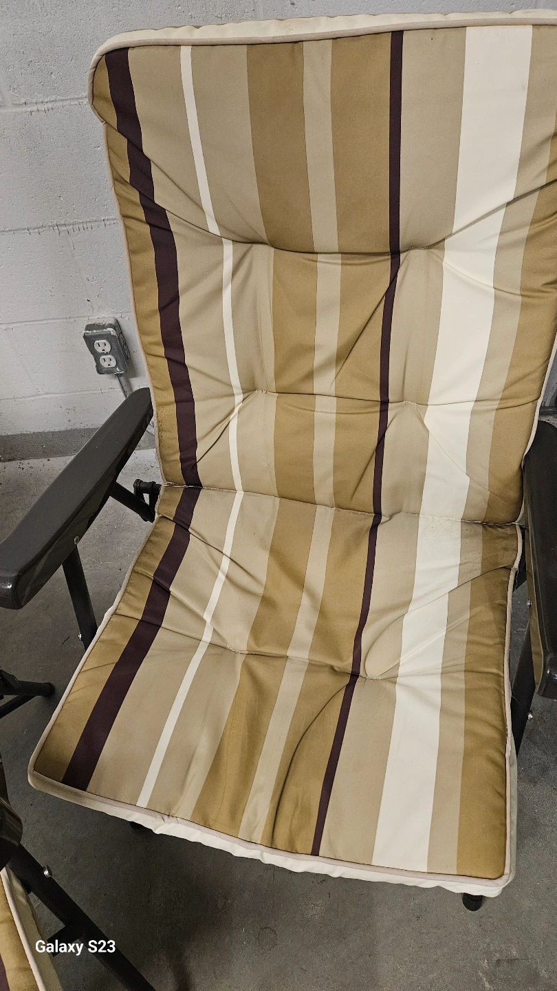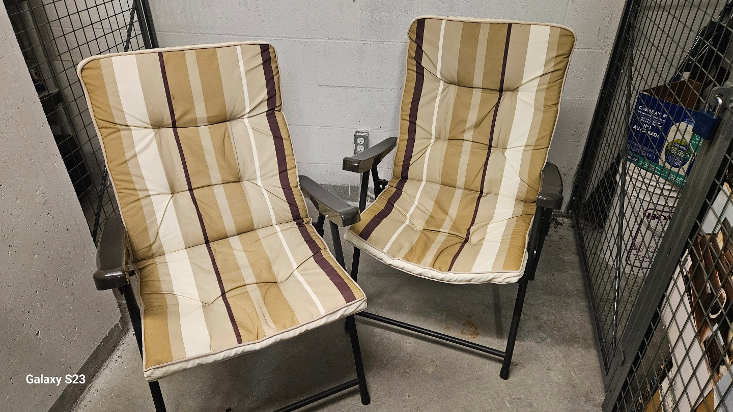 12Two outdoor folding chairs. Beige, brown and white striped cushions. Metal frame. Good for patios, balconies, or camping.