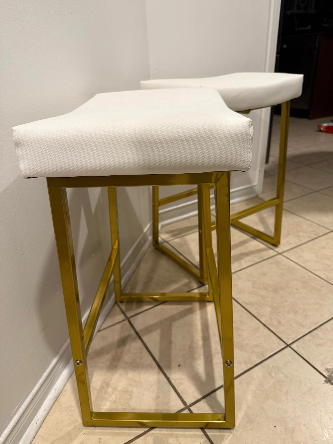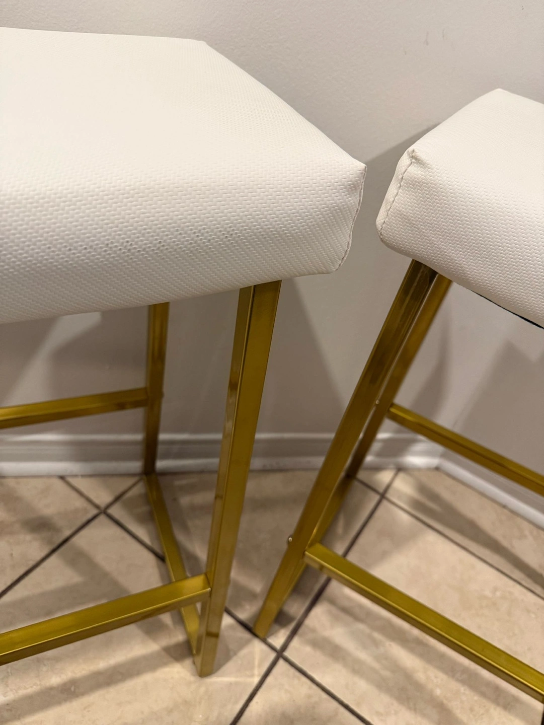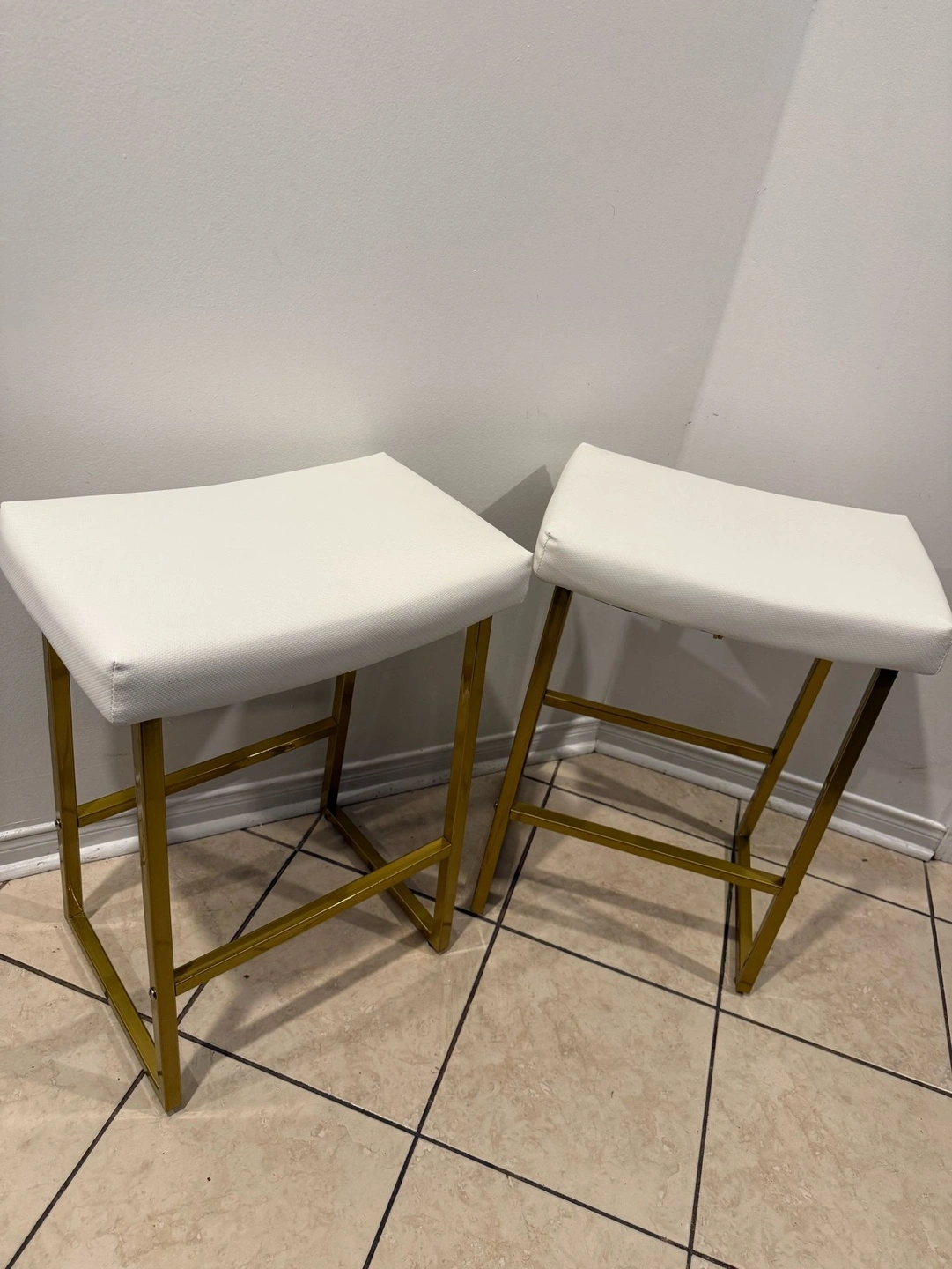 Set of two bar stools. Gold metal frame. White cushioned seats. Modern design. Good condition.