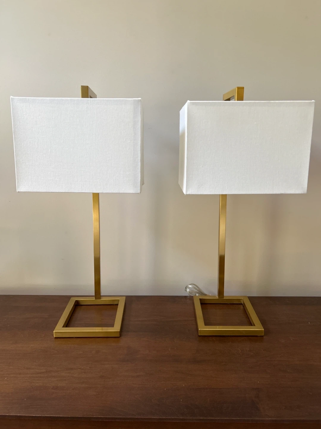 Selling a pair of modern lamps with gold bases and white shades! One shade is a bit bent and a small mark but not noticeable as it’s on the side. One of the on/off switches is loose could be replaced. 26”H.