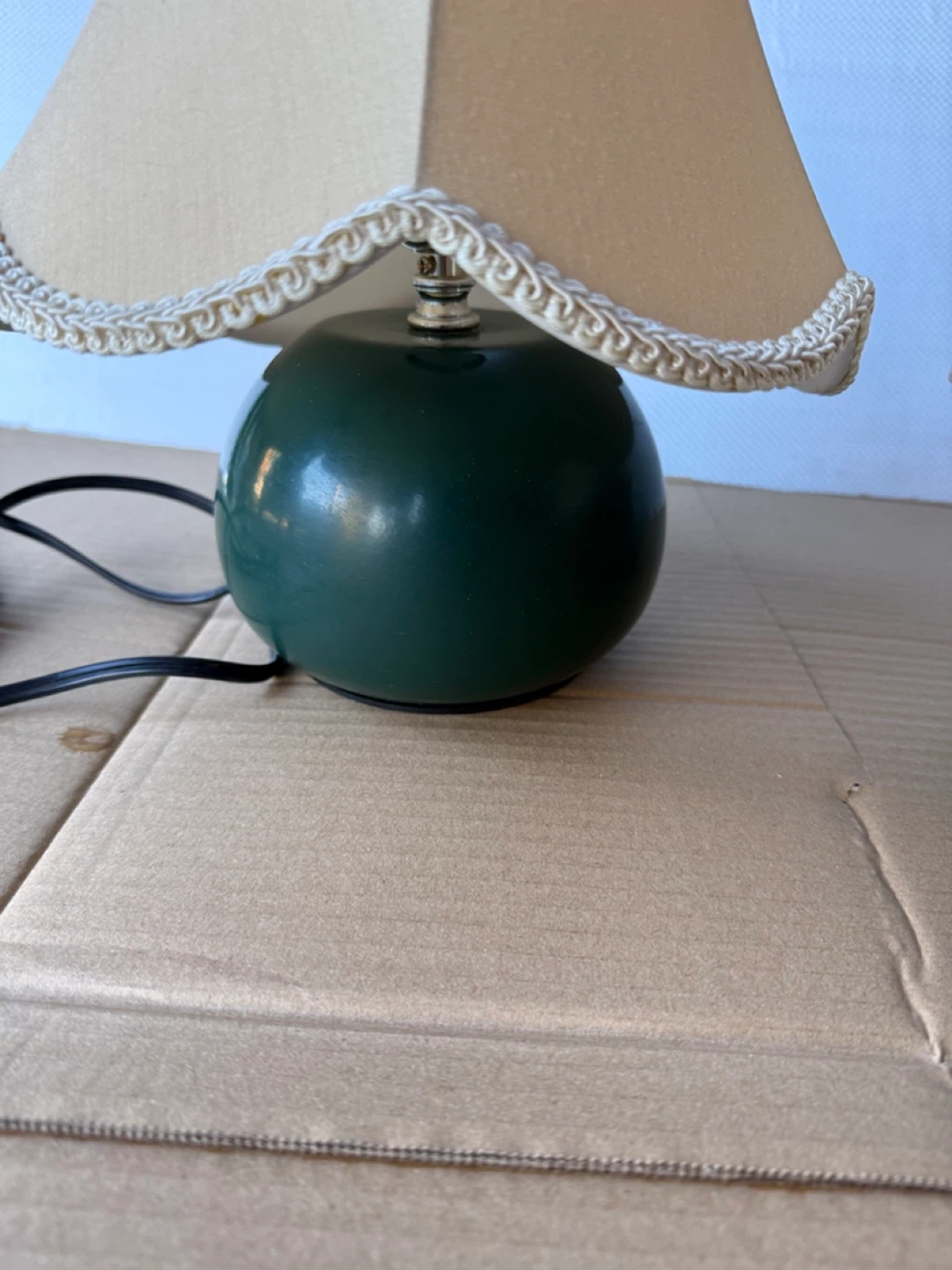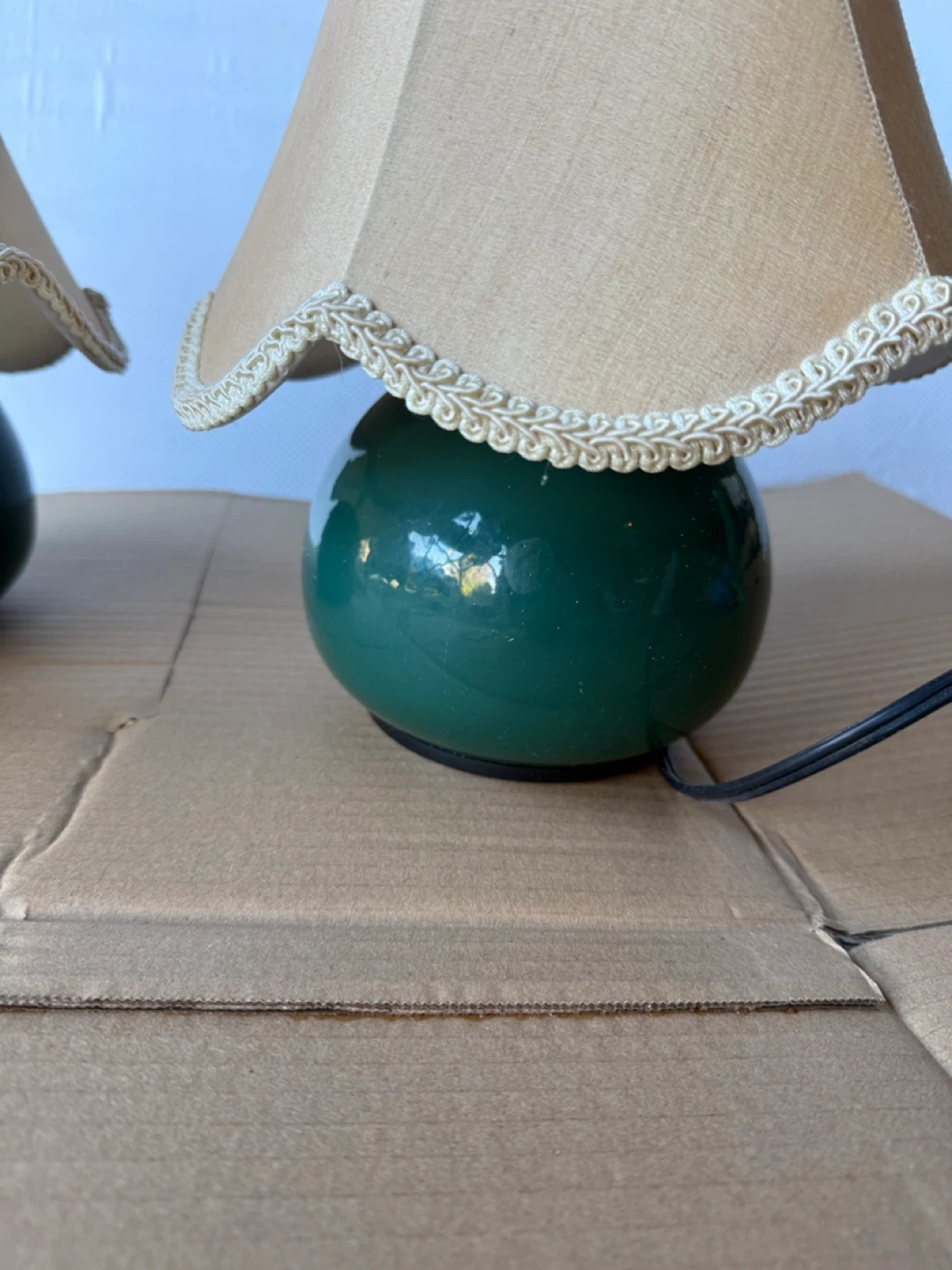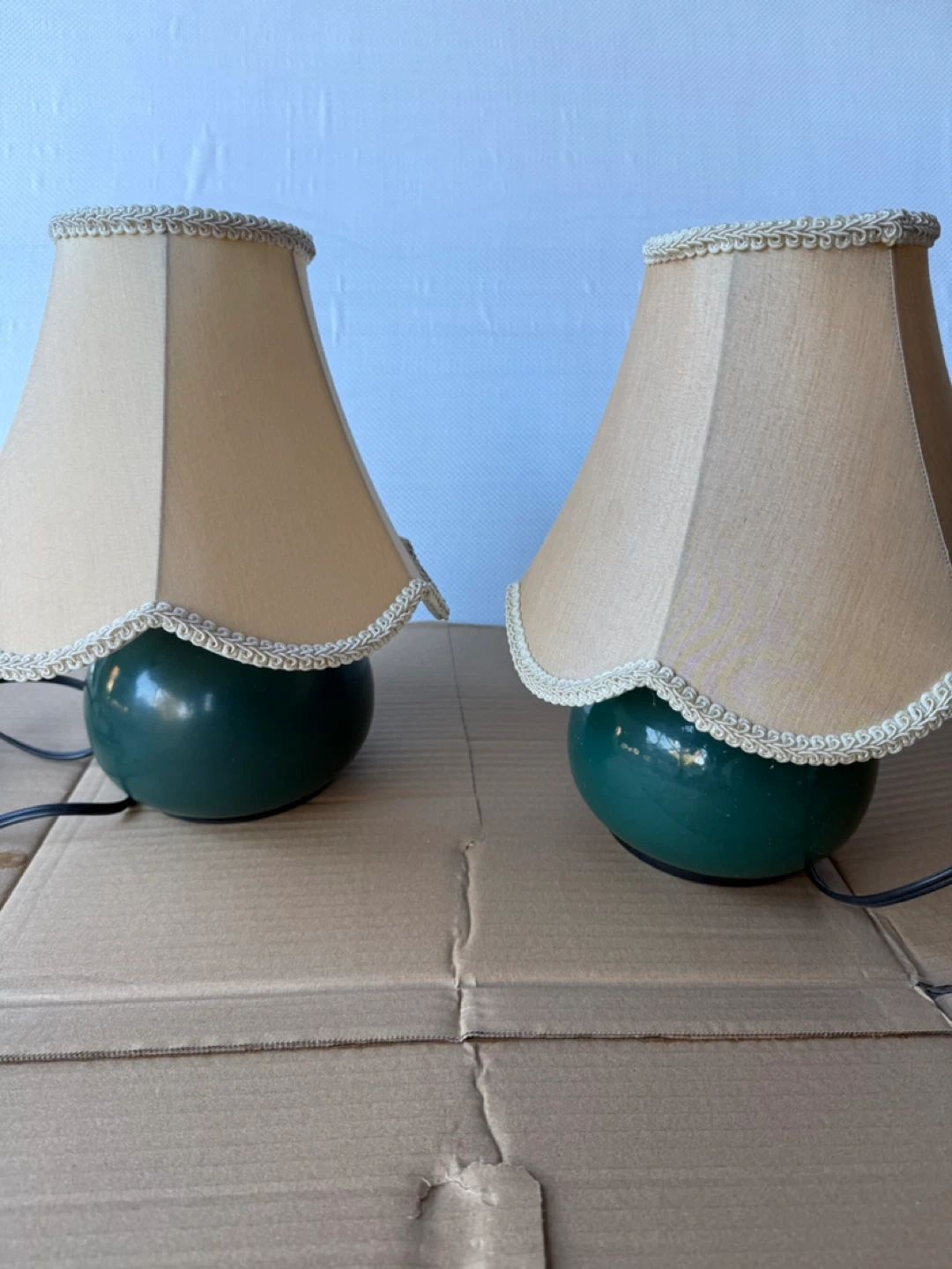 5Selling a cute pair of bedside lamps! They feature a green globe base and a beige shade with a decorative trim. Perfect for adding a touch of vintage charm to your bedroom or living space