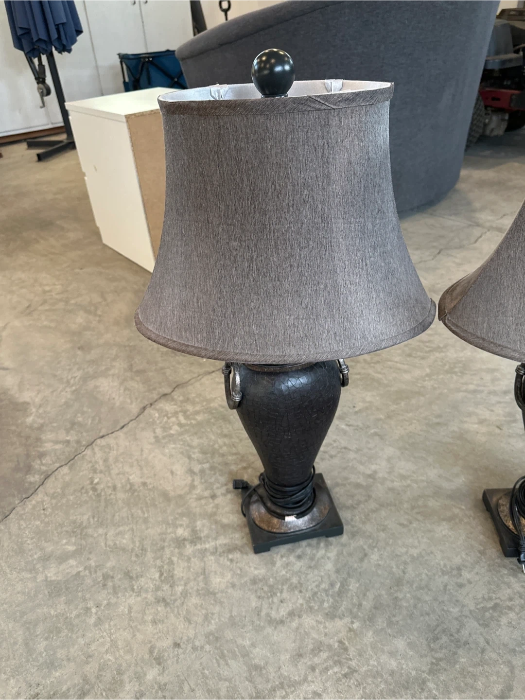 5Selling a pair of lamps that would look great in any room! They have a classic design with grey shades and a decorative base. They're in good condition and ready to brighten up your space
