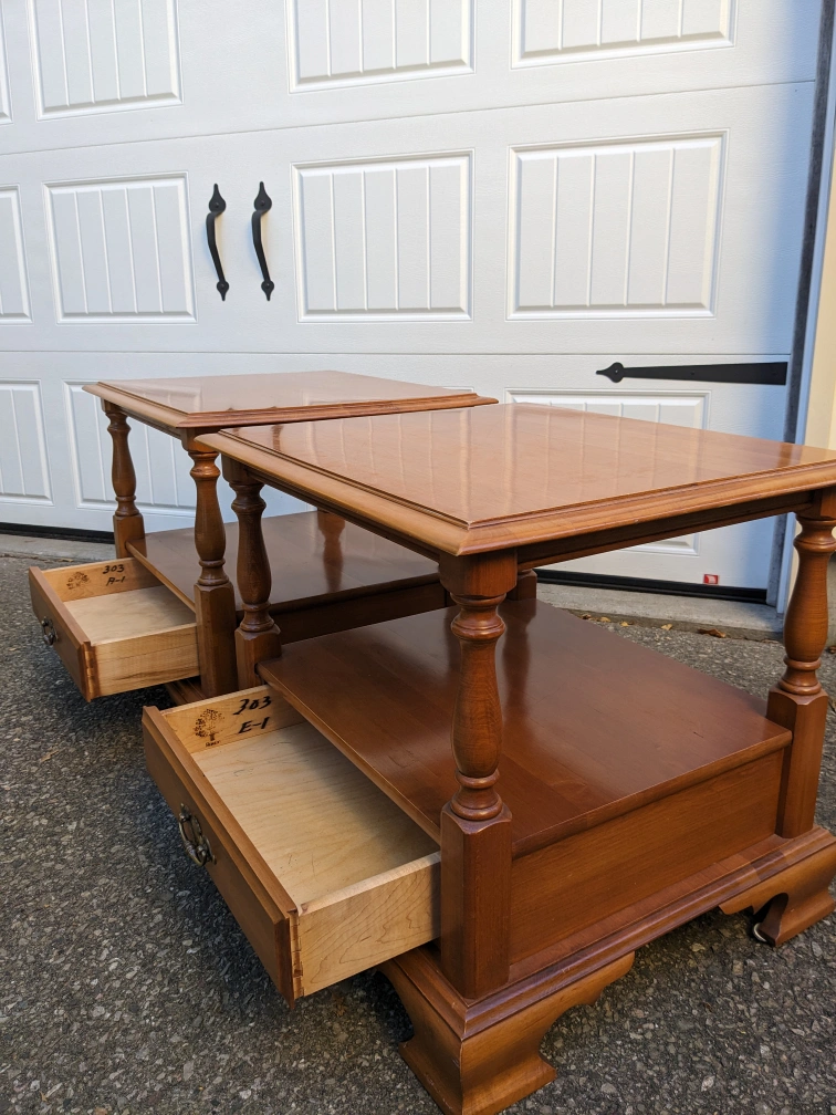 These matching nightstands by quality Canadian manufacturer Roxton, feature solid maple construction, drawers that all open and close smoothly and are in great condition inside. They each have one drawer and an open shelf for additional storage as well as spindle uprights giving them a traditional charm. There is very minimal wear from normal use on these pieces and are in excellent condition. Due to the lighter weight of maple, these pieces are easy to move in your space. Price is firm. Measurements: 24"W x 21"D x 21.5"H Curbside delivery is available for an additional fee, depending on location. The delivery fee must be prepaid; the remaining balance is due upon delivery.