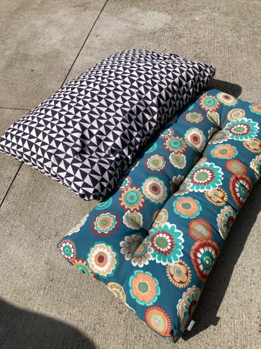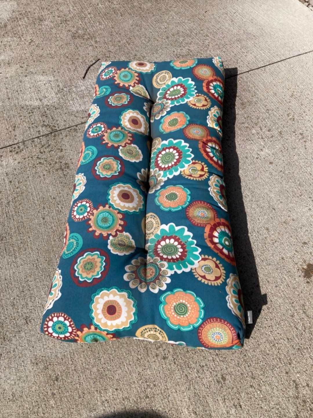 85Two outdoor bench cushions for $10. One features a teal floral pattern, other a black and white geometric pattern. Excellent for patio furniture. Needs a wipe down / wash. Cover comes out for the cushion in blue patter.