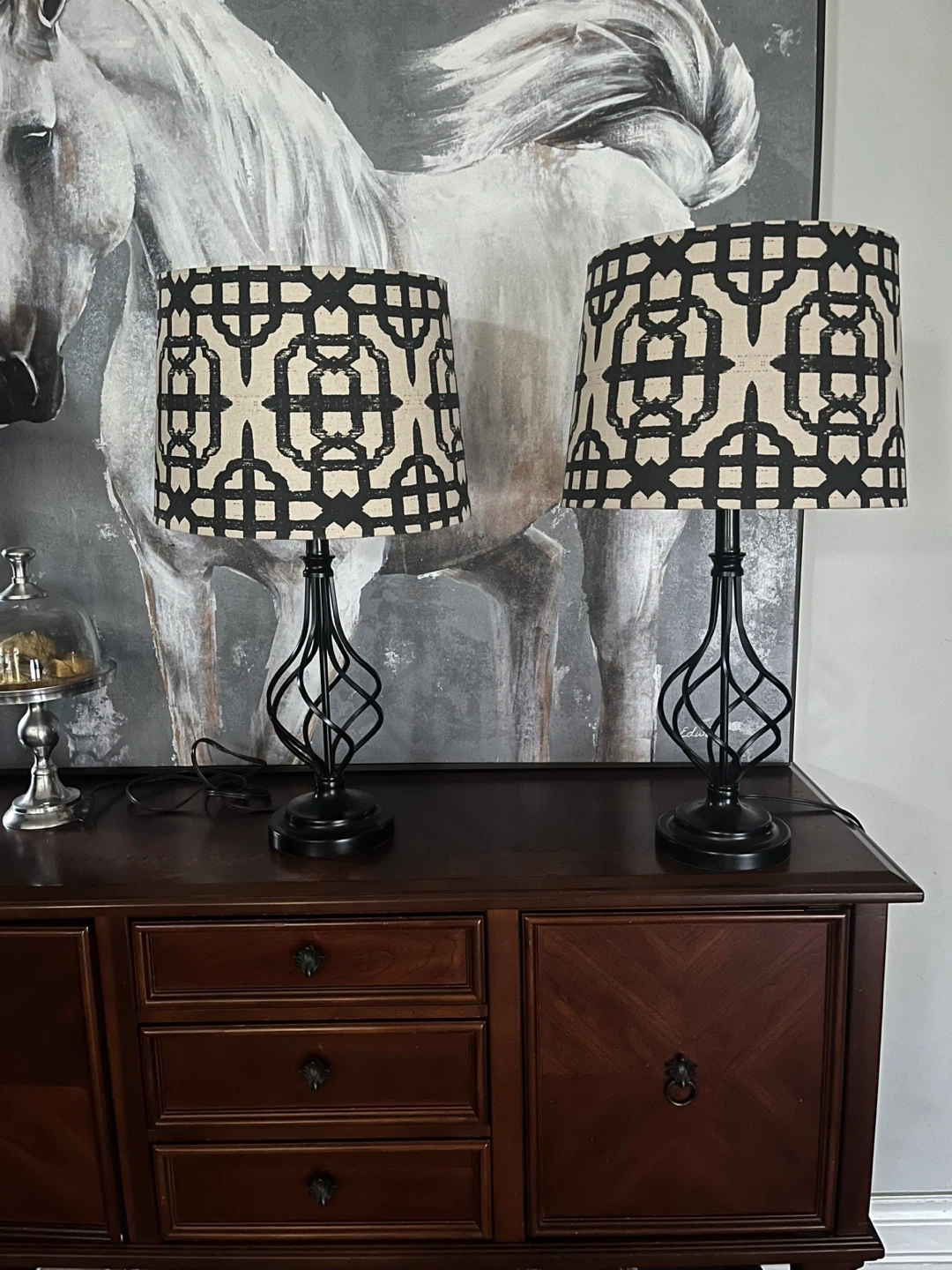 10Selling a pair of stylish lamps with a unique black and beige patterned shade. They have a black metal base with a decorative swirl design. These lamps would look great on a bedside table, desk, or console table!