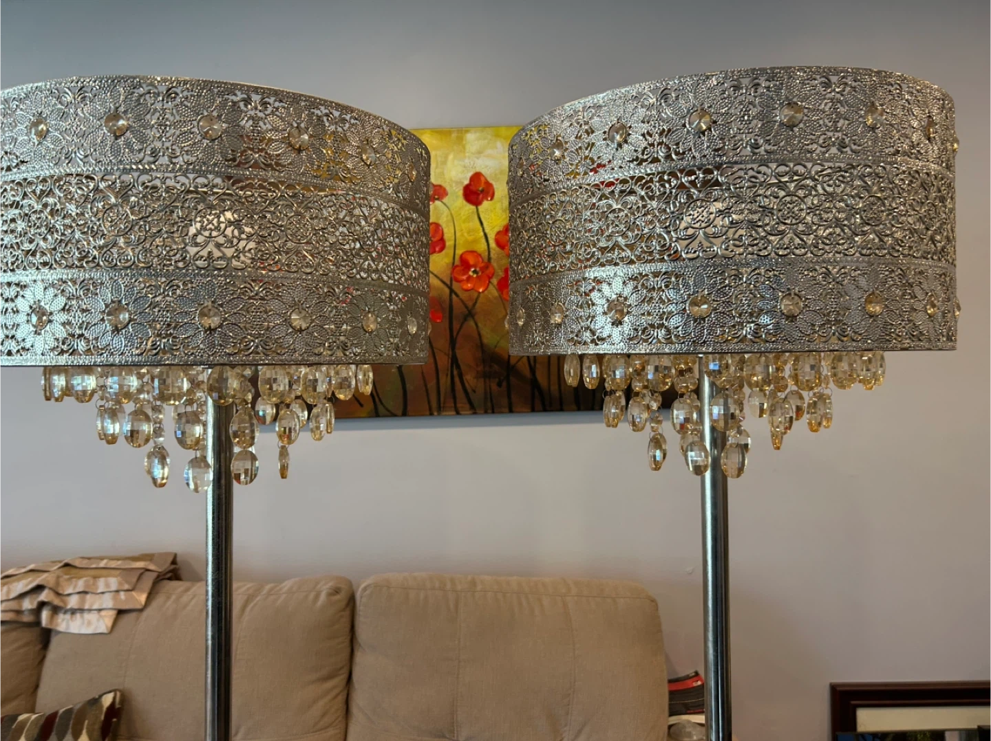 12Selling a pair of beautiful silver floor lamps. They feature an ornate design with hanging crystal-like accents. They would add a touch of elegance to any room!