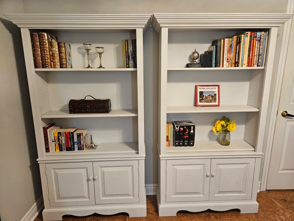 Selling charming solid wood bookcases that's perfect for adding storage and style to any room! It features open shelving up top for displaying your favourite books and decor, plus a handy cabinet at the bottom for tucking away anything you want to keep out of sight. They are in great condition and ready for a new home.