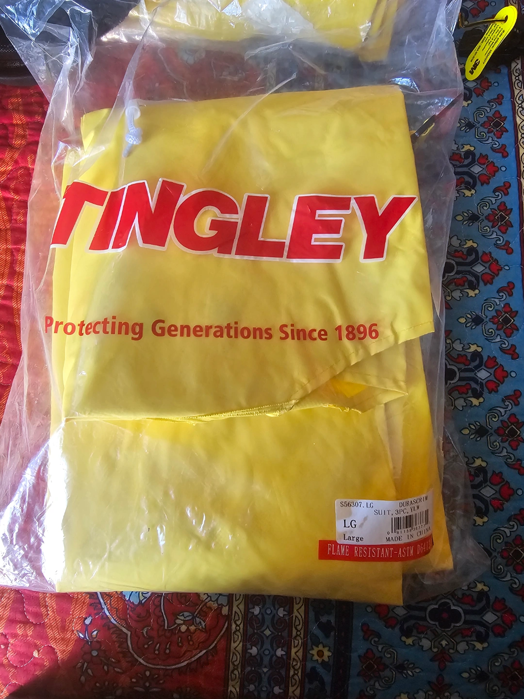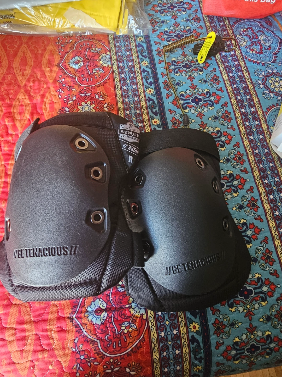 Protective gear bundle. Includes a pair of black Tenacious knee pads and a large yellow Tingley flame-resistant rain suit. Good for work or outdoor activities.