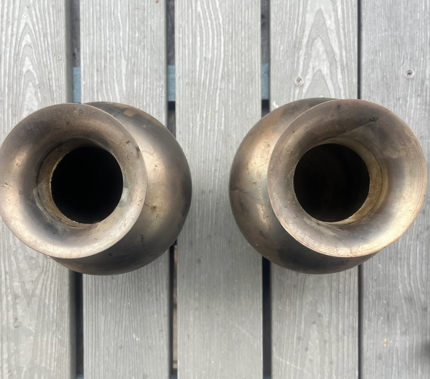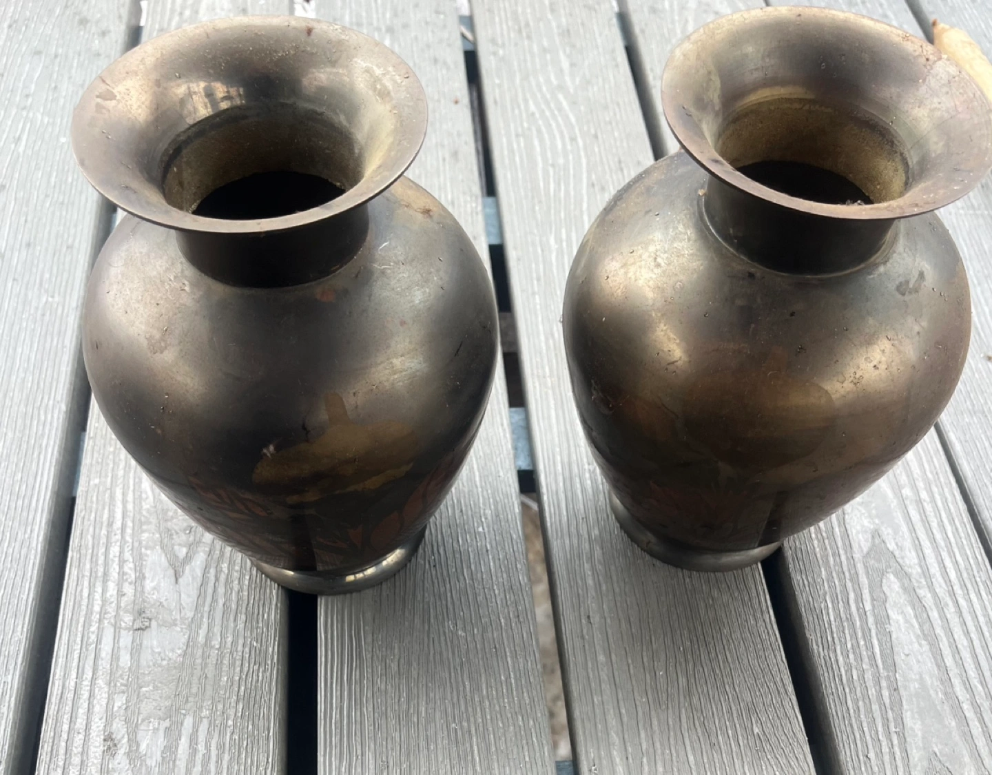 58Two antique brass vases. Dark patina. They show floral inlay. Great vintage decor.