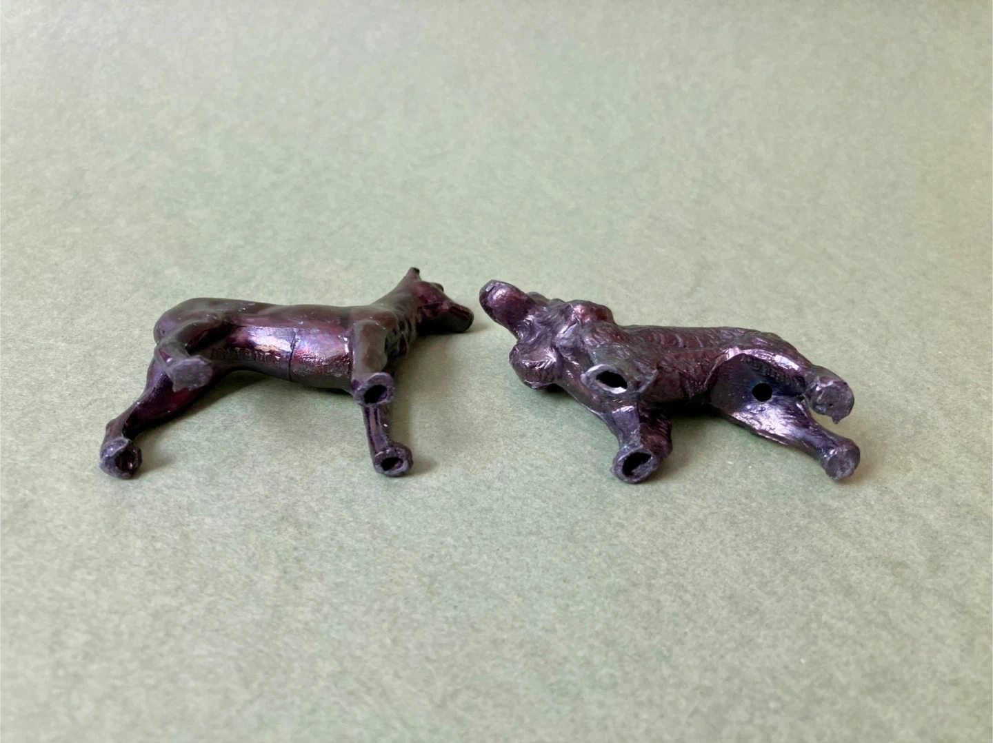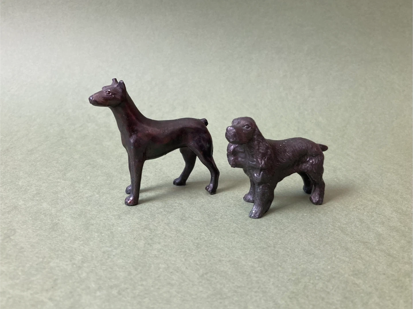 Adorable pair of vintage dogs. Looks like a cocker spaniel and a doberman. They are marked FOREIGN underneath. I’m not sure what the marking indicates but they appear to be cast bronze. The cocker spaniel has a tiny spot of green oxidization. They are each about 3 inches wide. Pick up in the Ossington and Davenport area. Price is for the pair. Check my other listings for more unique vintage home decor. 🙂