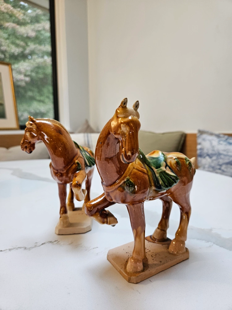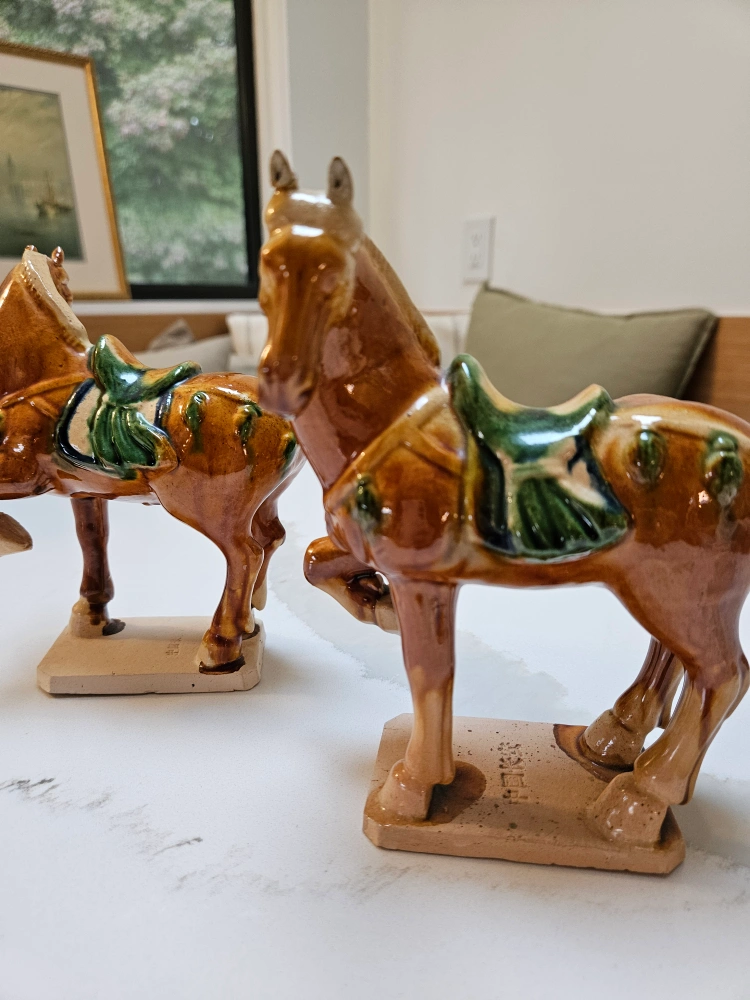 Selling a pair of vintage ceramic horse figurines. These are in great condition and would look lovely as decor in your home! Beautiful pair of Vintage Tang Dynasty Style horses
