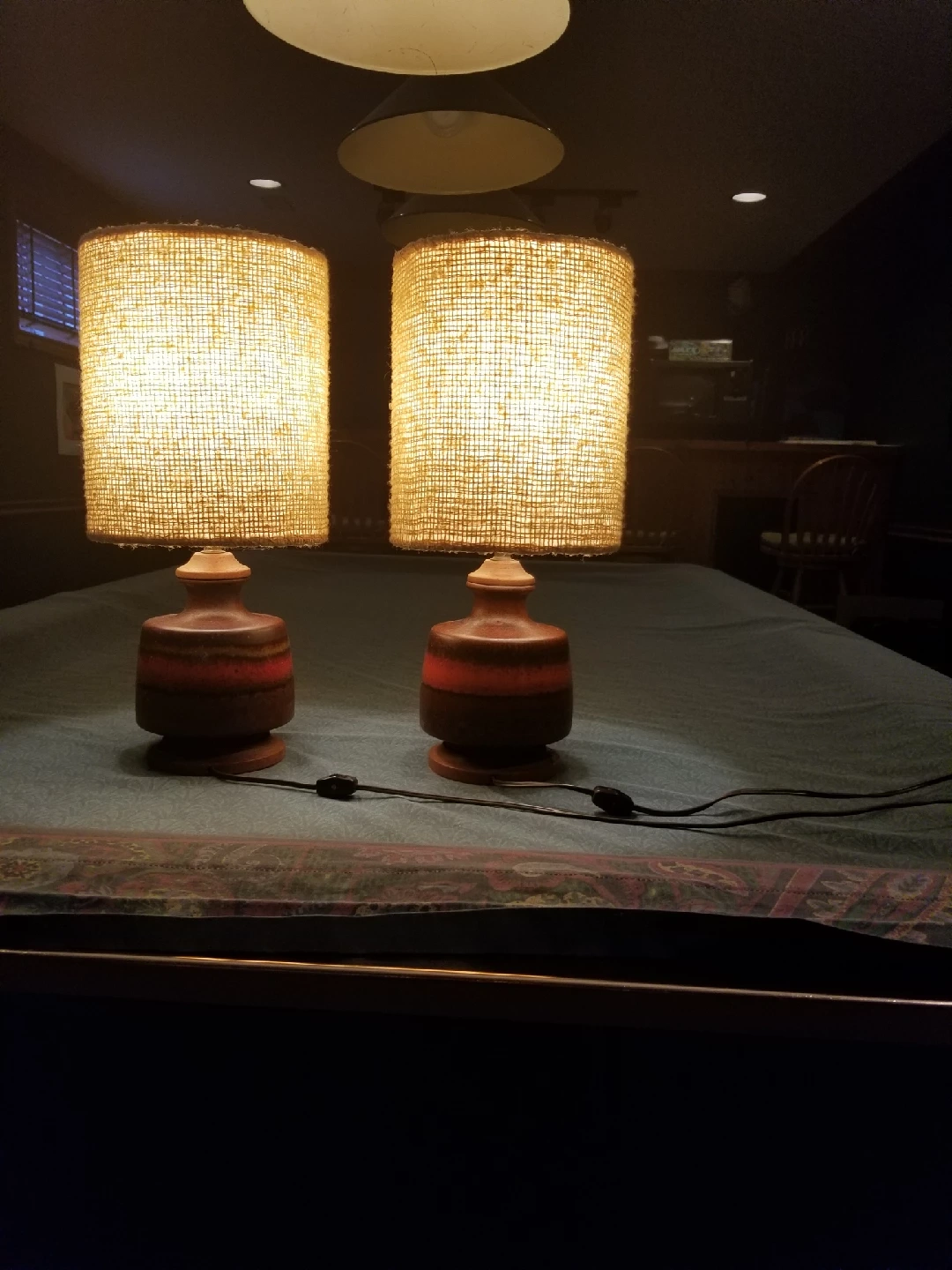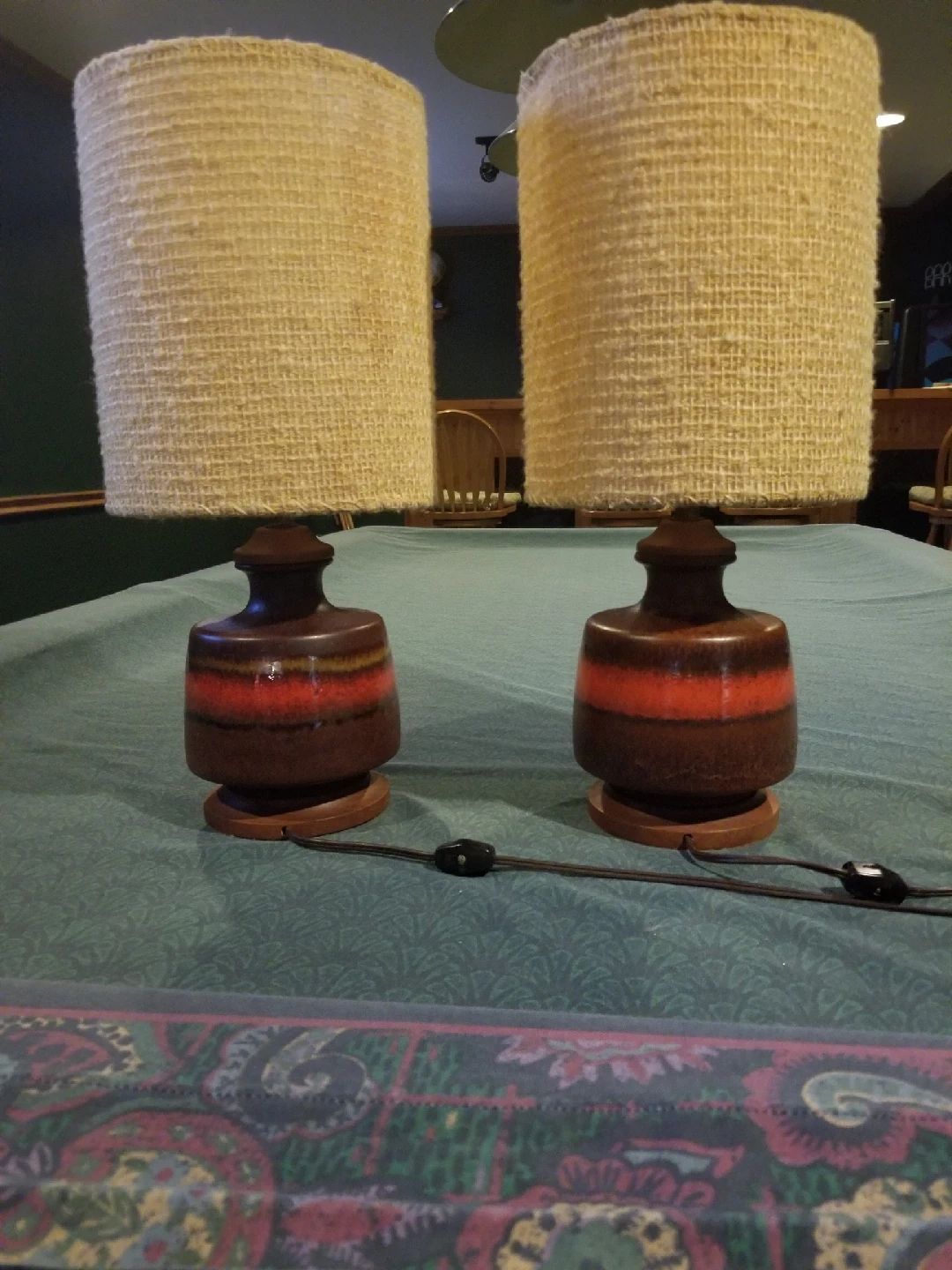 10Selling a pair of vintage table lamps. They feature a ceramic base with a brown and red stripe design, topped with a textured beige lampshade. They would make a great addition to any room! pick up in uxbridge