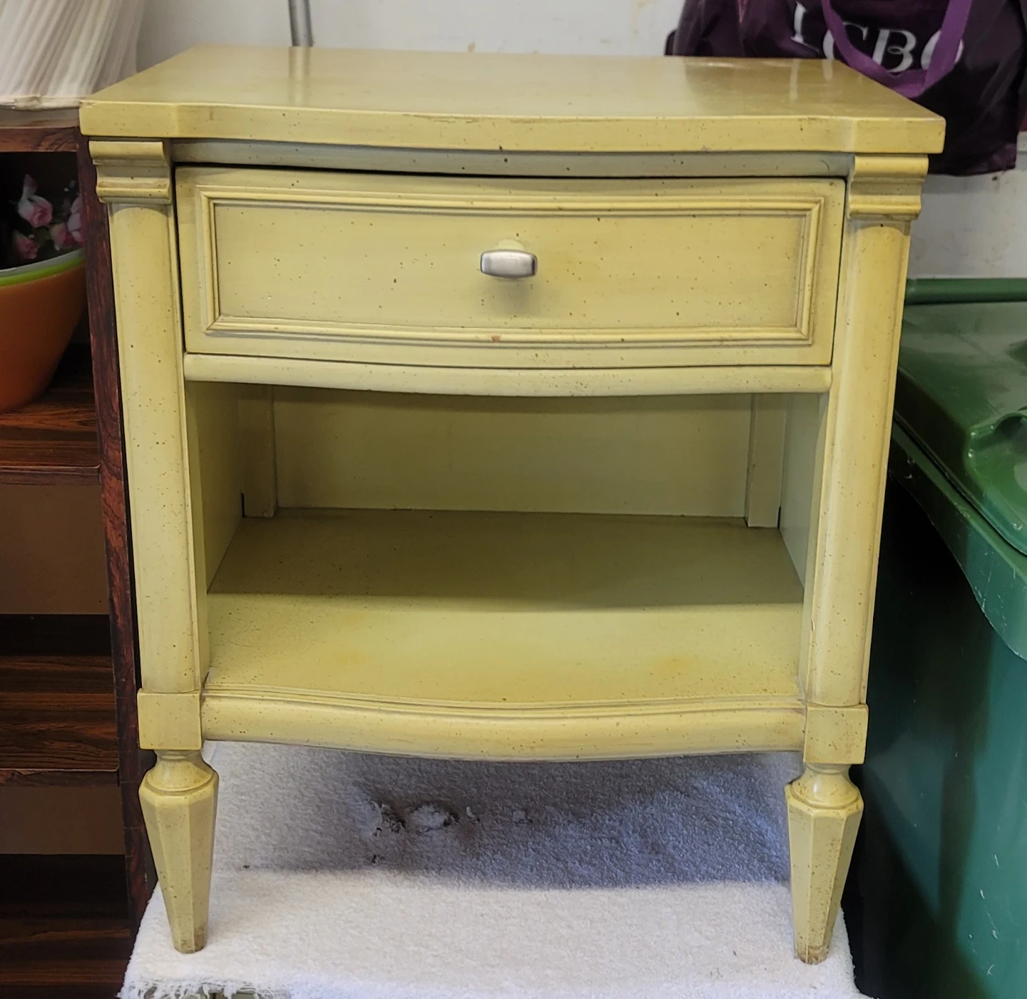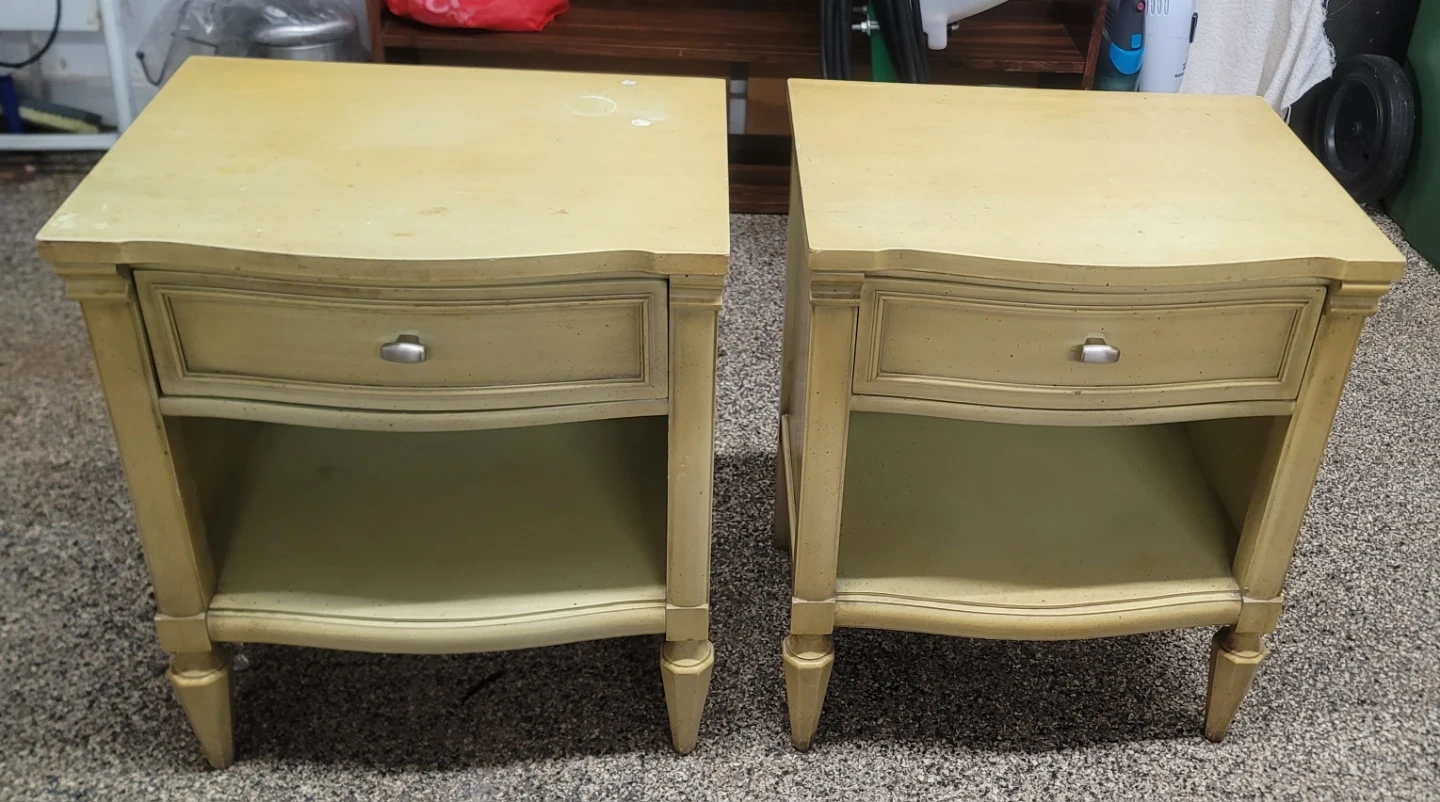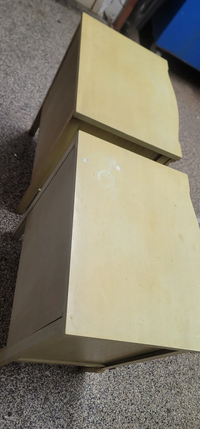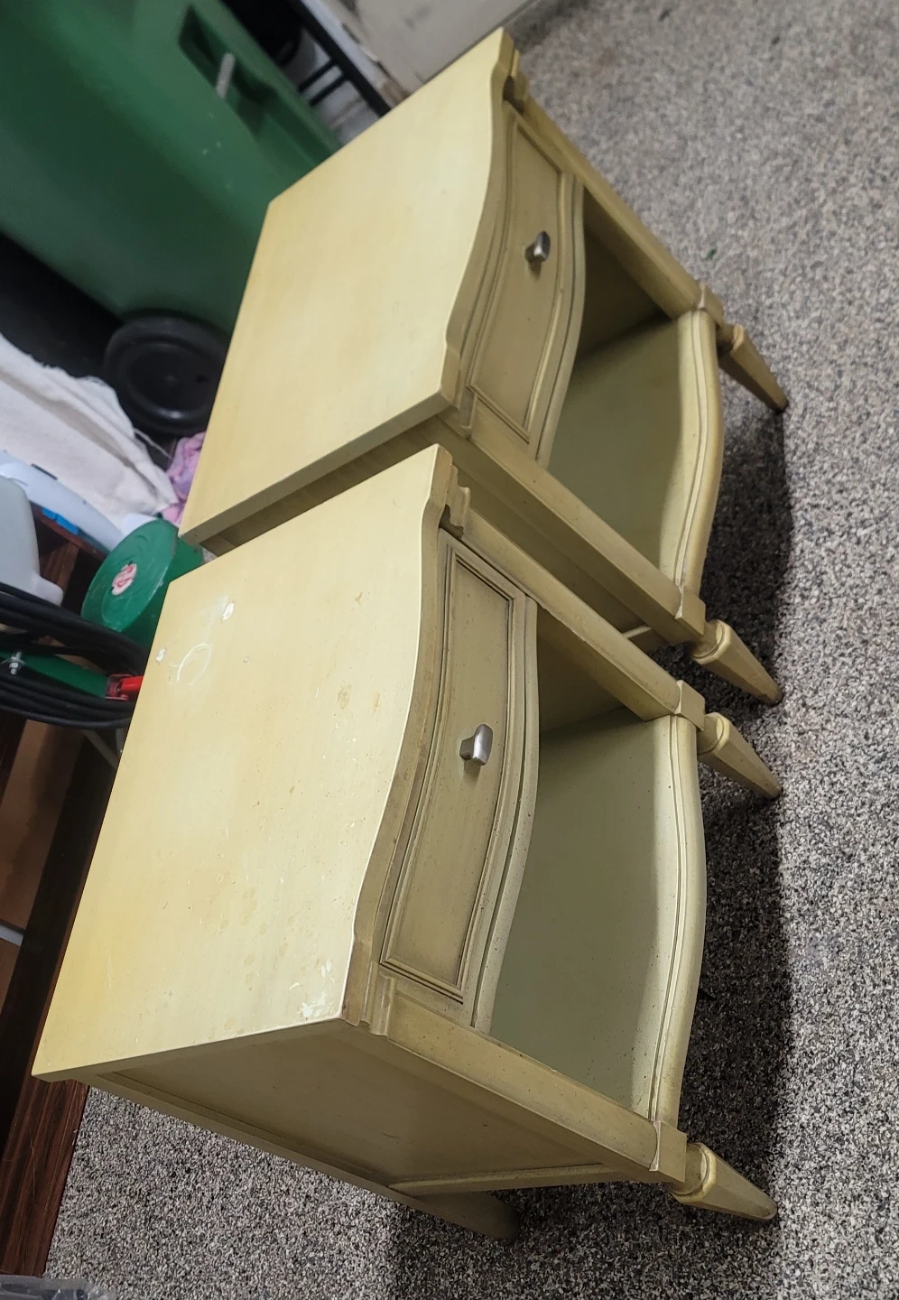 111Selling a pair of vintage side tables. They have a classic design with a drawer and an open shelf. Perfect for adding a touch of retro charm to your bedroom or living room!