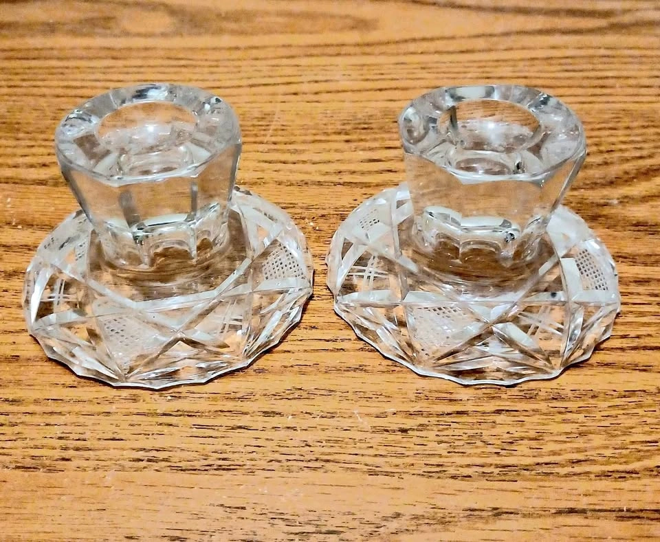 65Pair of Vintage Crystal Candle Holders. Made of Heavy Lead Glass with deep, Geometric The Cuts create Patterns of Hobstars and Fans, giving the glass a Sparkling Appearance. High-quality Craftsmanship. Excellent Condition, no chips or cracks. Please check out my other rare collectibles!