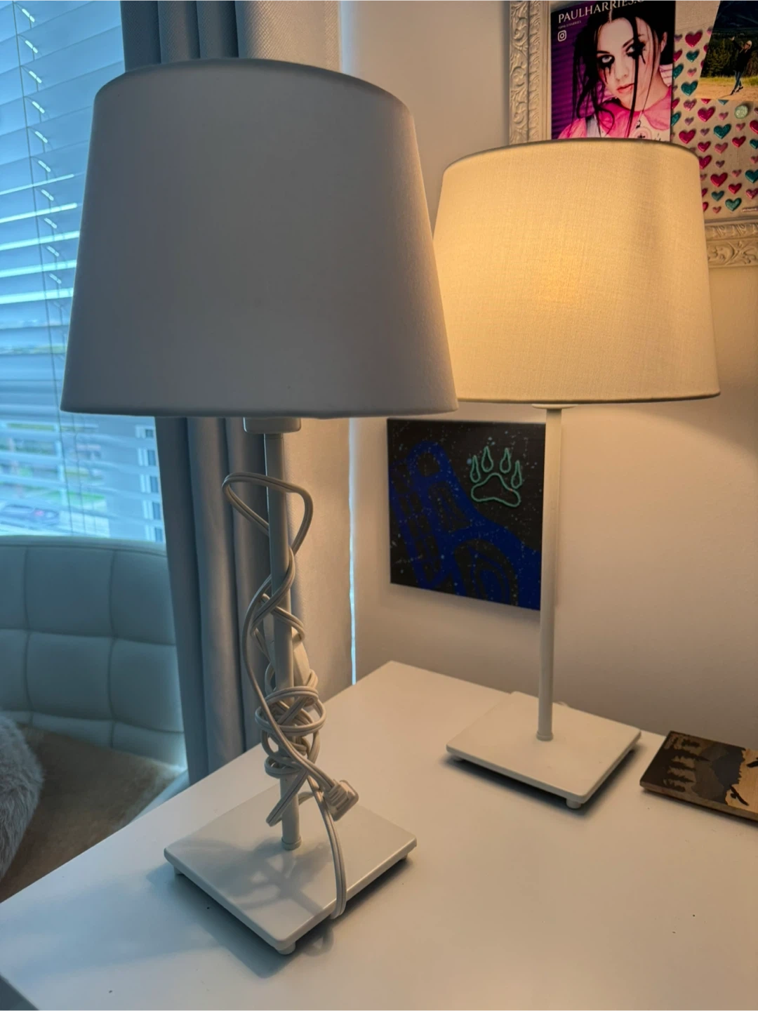 92Selling a pair of white table lamps. Great for bedside tables. Very good condition. Base 5x5” Height 19” Shades: 7” top diameter, 9” bottom diameter. $5 each or both for $8. Bulbs not included.