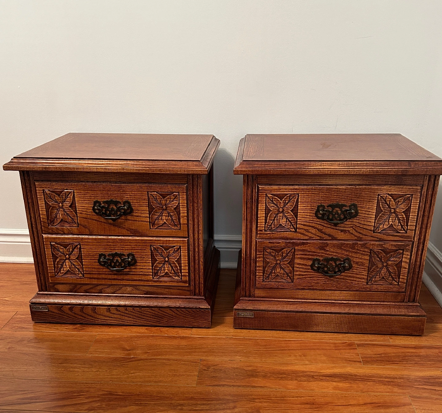 235Selling a pair of solid wood nightstands. They have a beautiful wood grain finish and feature two drawers each. Perfect for adding a touch of classic style to your bedroom! Width: 20 inches Height: 16 inches Depth: 18.5 inches