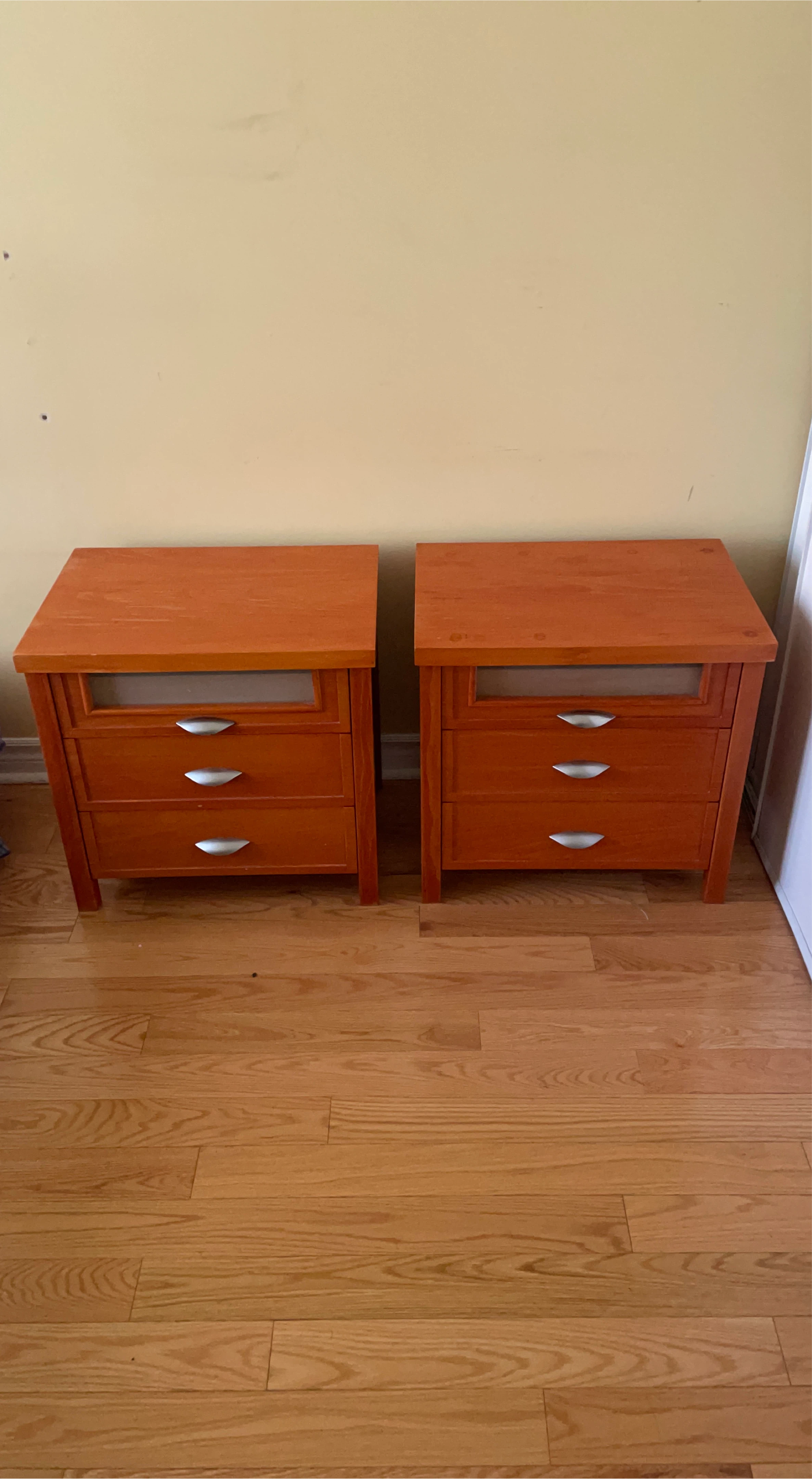 Selling a pair of wooden nightstands. They feature three drawers with silver-toned handles. Perfect for adding some storage to your bedroom! Measurements: Length: 22 inches Height: 21 inches Depth: 15.5 inches