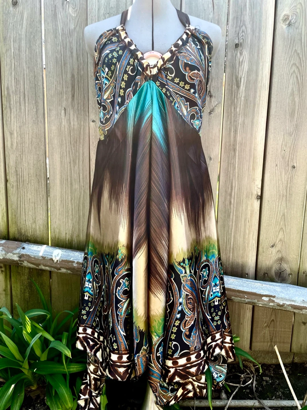 Handmade by yours truly. This dress features a unique paisley pattern with shades of brown, turquoise, and cream. One of a kind It's halter style, size is small yet would easily fit a medium as well!