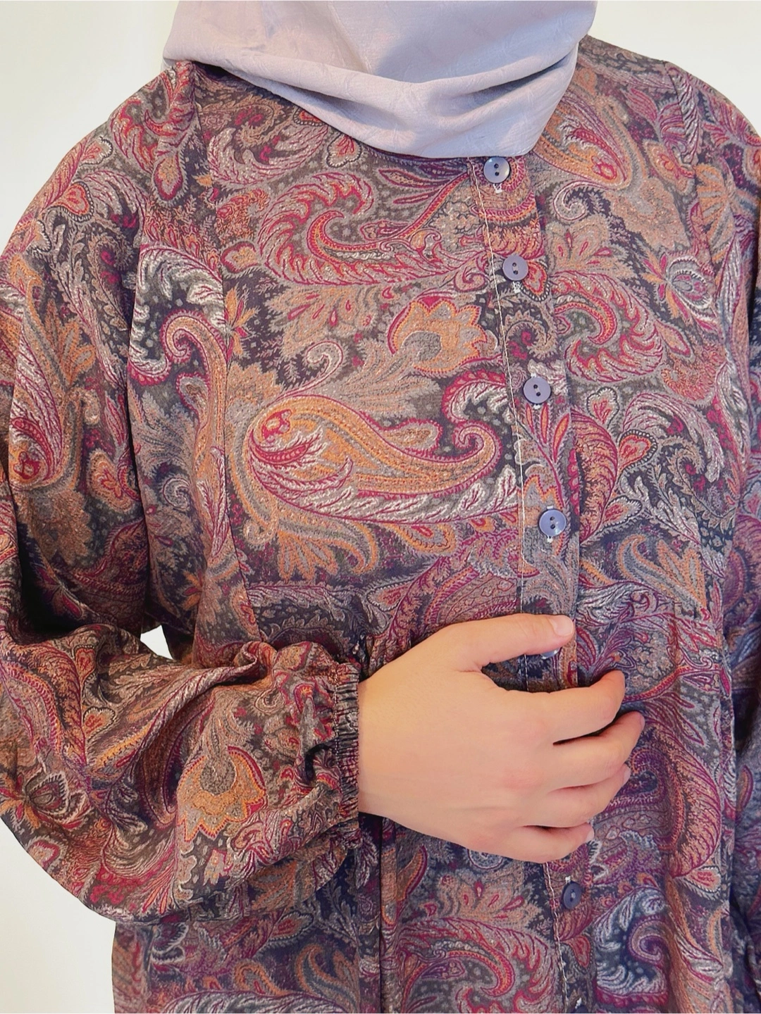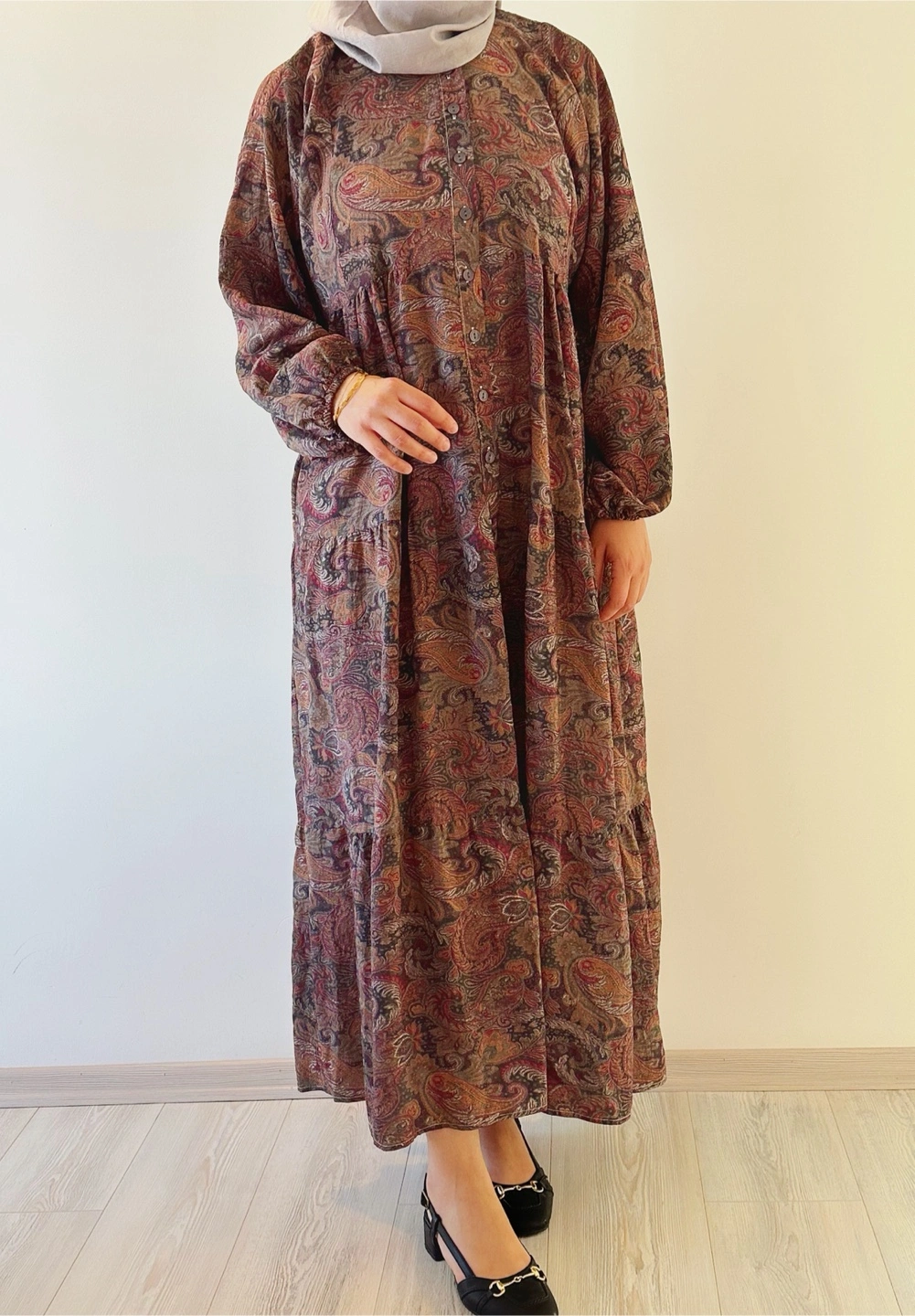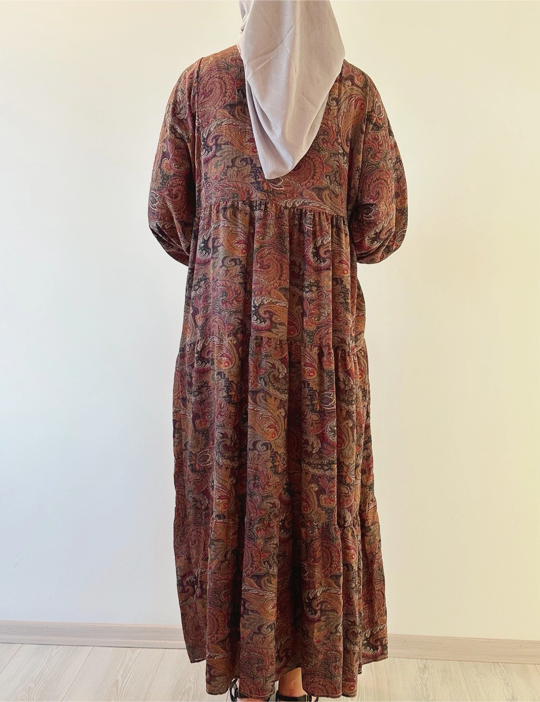 Here's a lovely paisley print maxi dress! It features long sleeves and a tiered design. Perfect for adding a touch of bohemian flair to your wardrobe