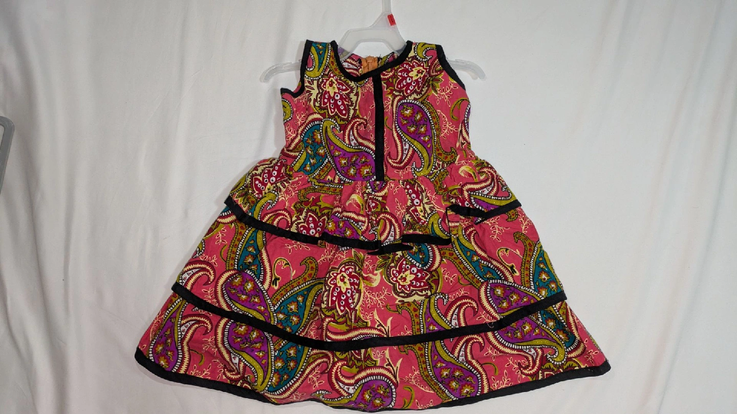 Cute paisley print dress with tiered skirt and black trim. Perfect for a little one!