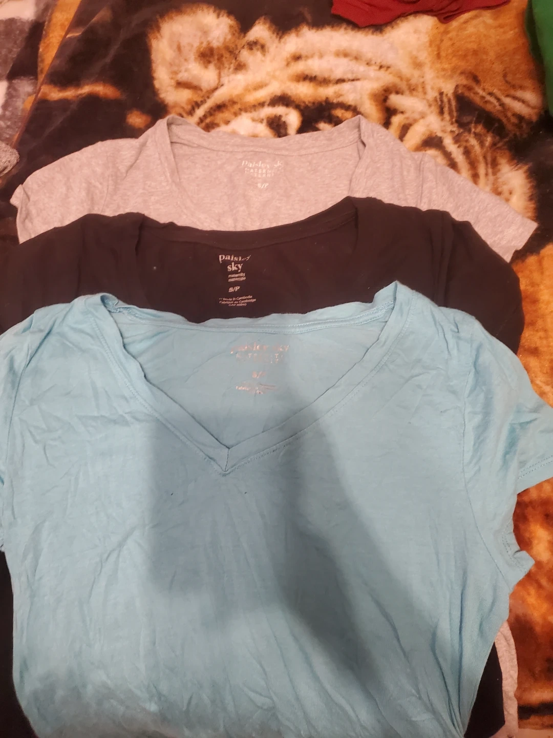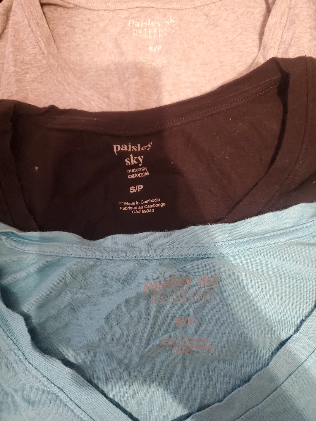 31Selling a set of Paisley Sky maternity shirts in size small. There's a light grey, black, and light blue one. They're in great condition and perfect for expecting mothers