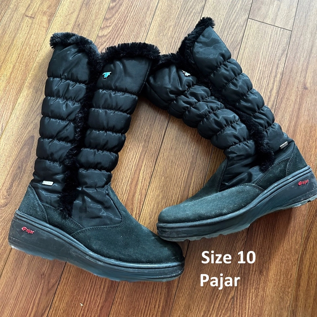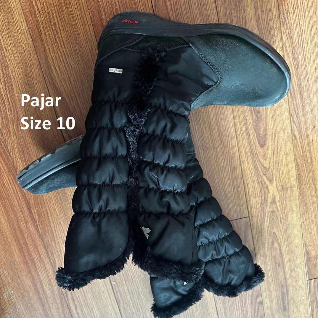 89Black Pajar winter boots with faux fur lining. WARMEST - Built for the harshest elements, innovative heat-concealing boots are crafted for protection against the coldest winter temperatures and frozen terrains. With hints of the snowboarder, Wanaka’s warm, waterproof silhouette welcomes winter’s windy walks… all the while looking good and keeping you warm. An ultra-thick sole compliments the ultra-thick sentiments of the rest of the boot: big boots mean little challenges out in the cold. Lined warm, and grippy for a sure step. It's big on me, I've worn it twice $290 is original price Pickup: Weekdays 8 am to 6 pm Markham (Highway7 and Woodbine) 7 pm to 9 pm Downtown(Fortyork and Spadina) Let's confirm the location on weekends