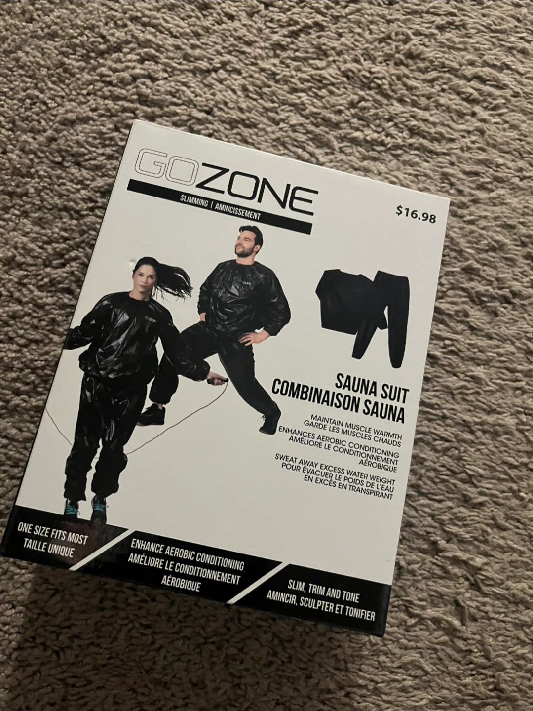 This is a GoZone sauna suit designed for slimming and increased aerobic conditioning. It's a one-size-fits-most item that helps you sweat away excess water weight. It's great for maintaining muscle warmth and can help slim, trim, and tone your body.