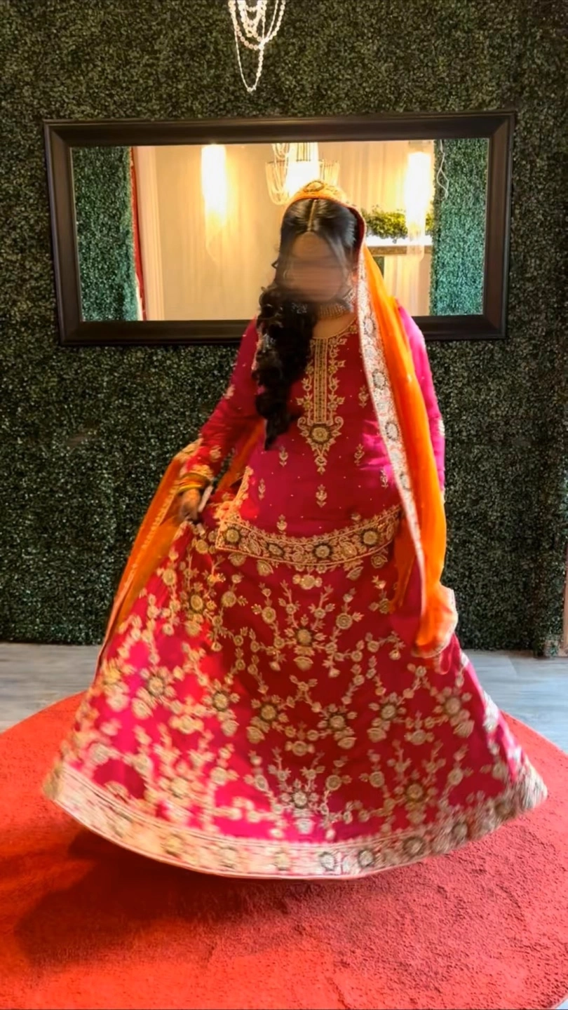 Hot pink and bright orange pakistani/indian heavily embroidered mehndi bridal lehenga for sale. Worn only once so great condition.