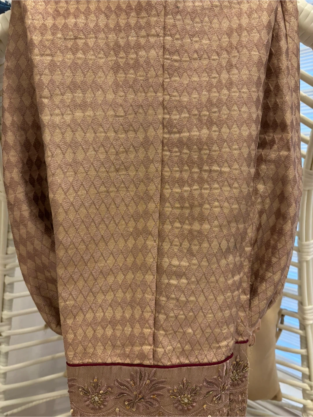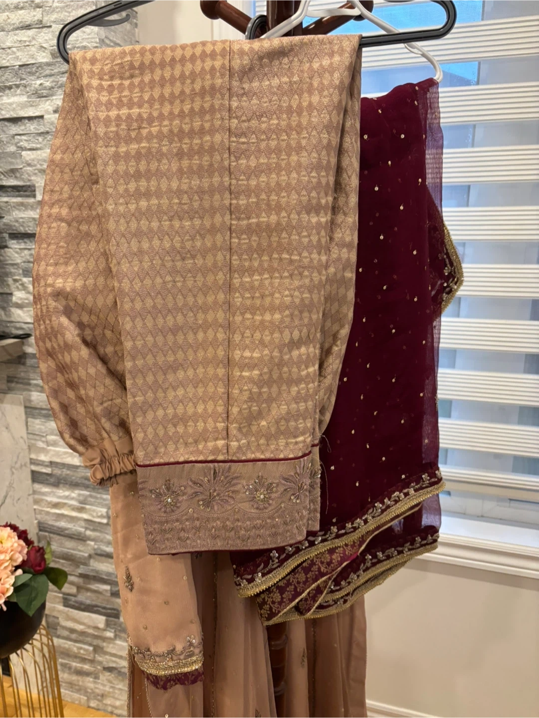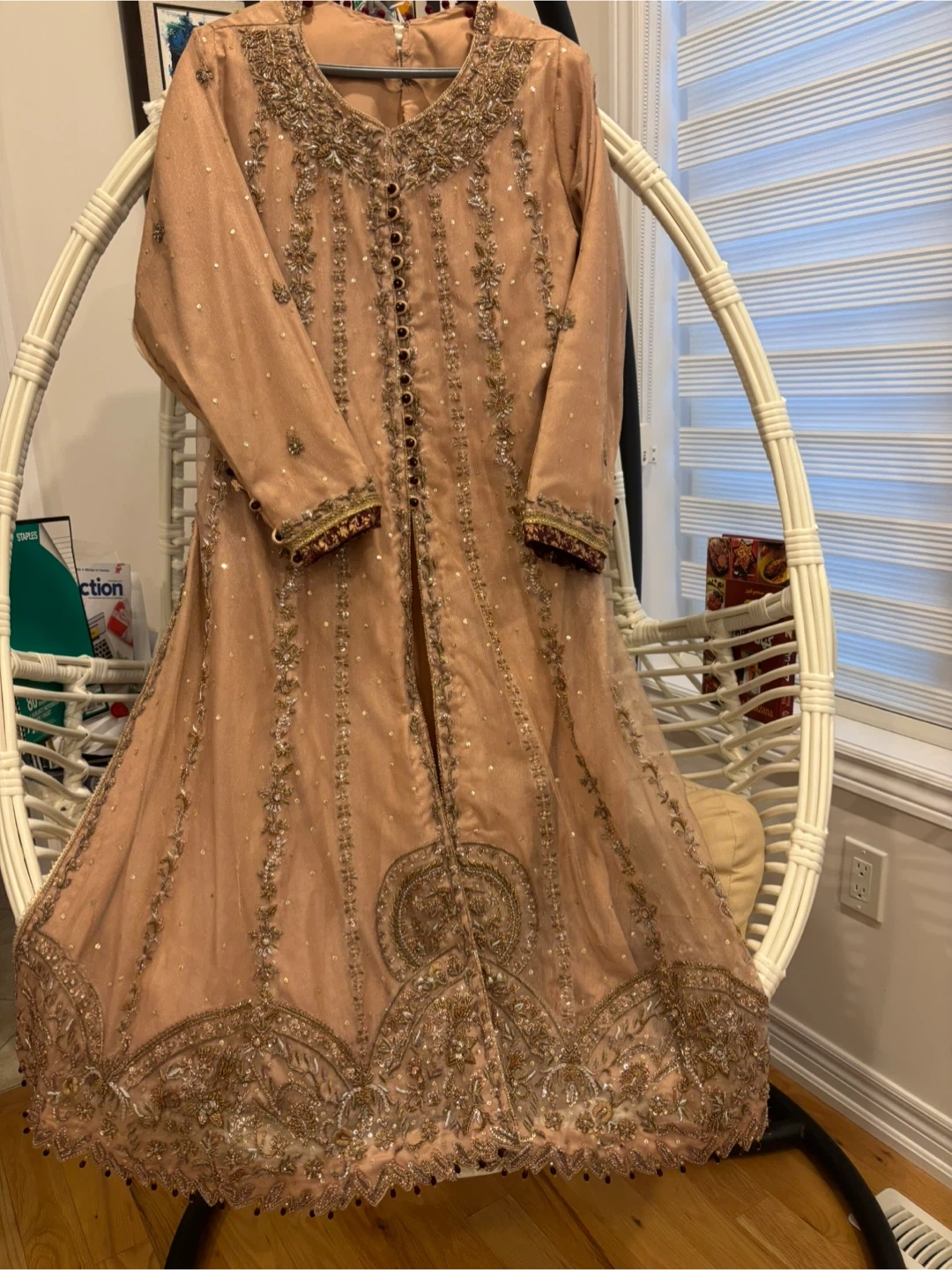 20Beautiful Pakistani formal dress with intricate embroidery and beadwork. The dress features a long, flowing silhouette and is perfect for weddings or special occasions. Includes matching dupatta. Customized design and color of their original design with Gunghat designer on Tariq Road L 48” Hip 24” Chest 19” Sleeves 22” Trouser L 38” Hip 27” Gently worn once