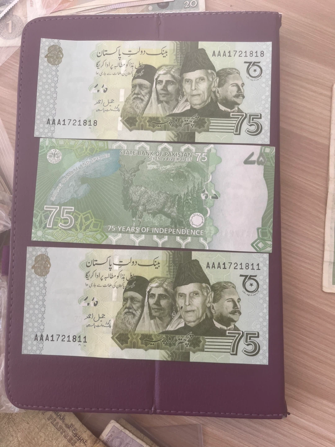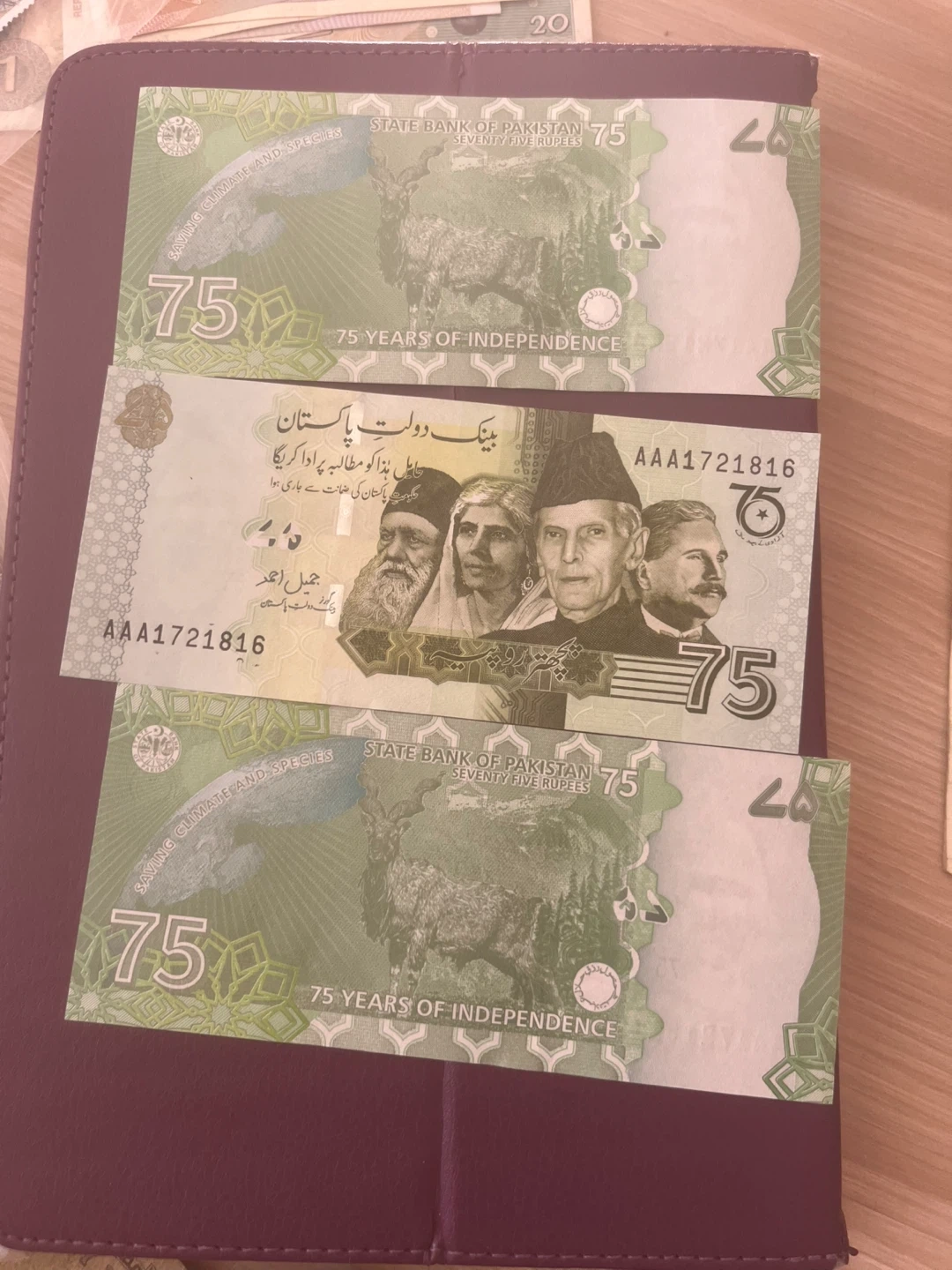 Four dollars each 75 Rupee Pakistan notes commemorating 75 years of independence. Perfect for collectors or anyone interested in unique currency!