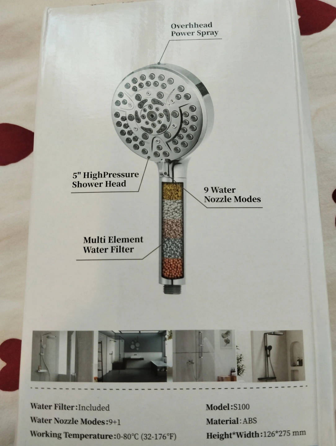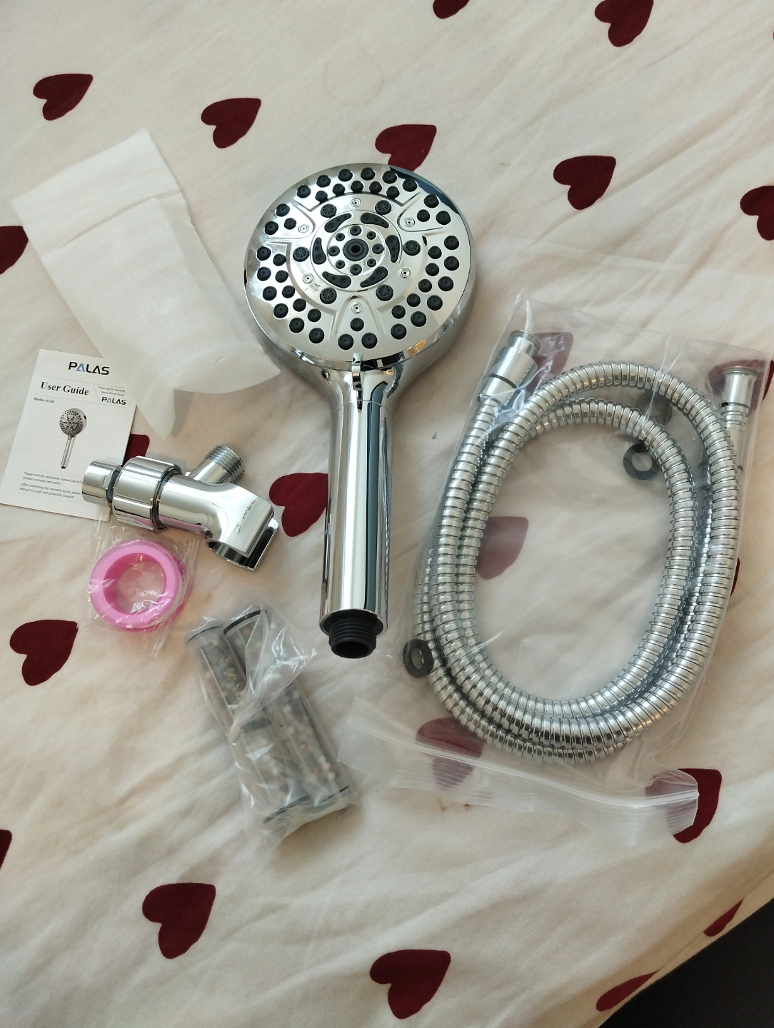 New PALAS handheld shower head. Chrome finish. 9+1 water nozzle modes. Includes water filter. High pressure. Water saving. Includes all parts for installation.