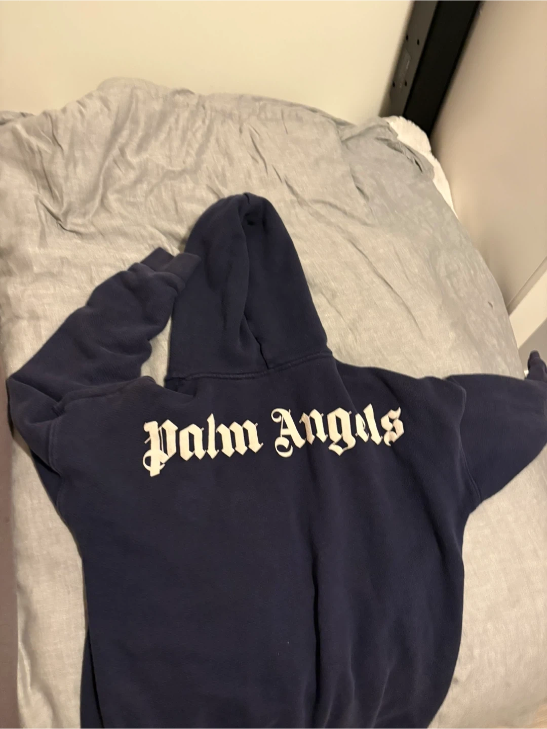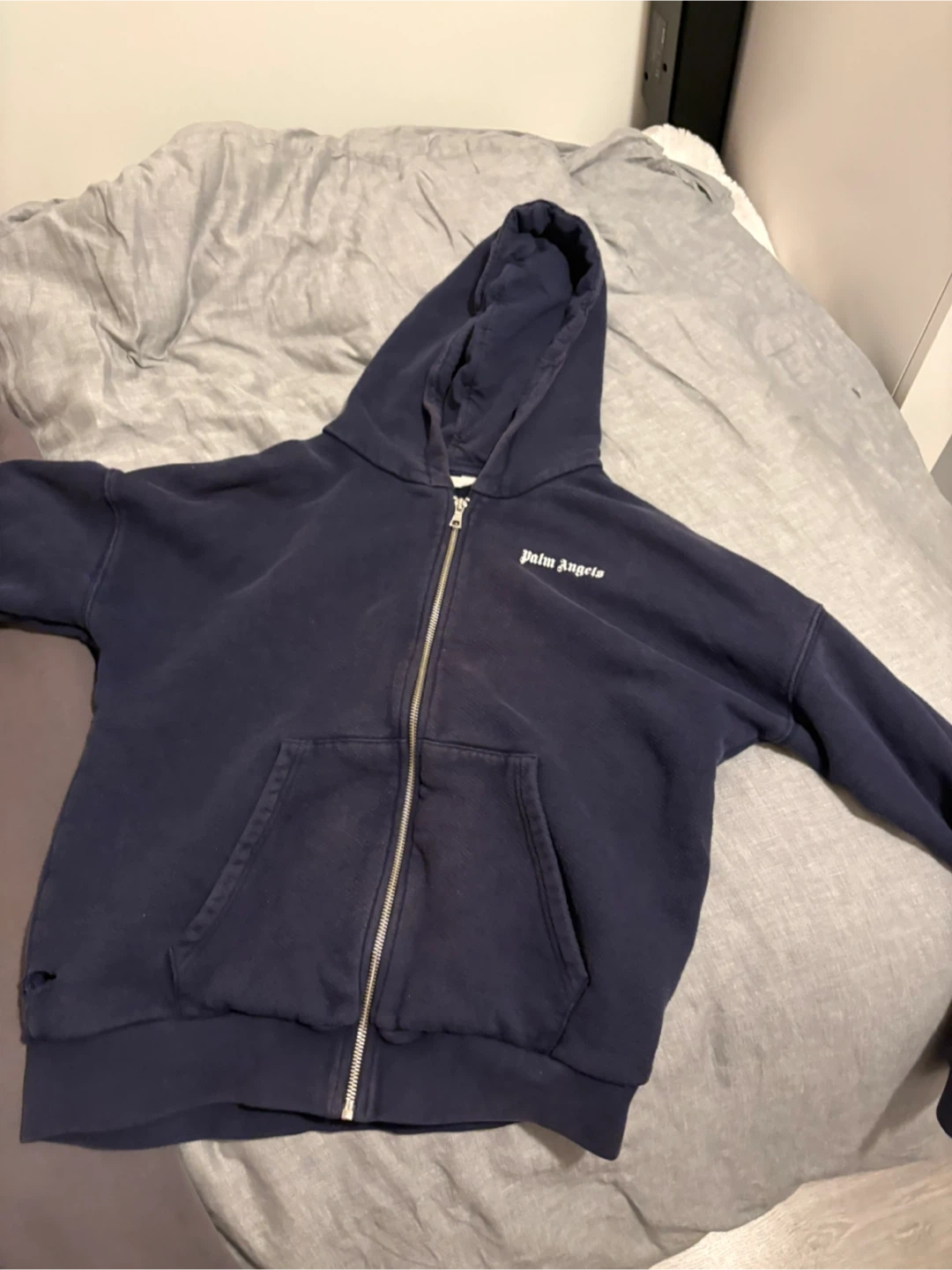 Selling a Palm Angels hoodie in blue. It's a zip-up style with the Palm Angels logo on the back. It's in good condition and ready for a new home!