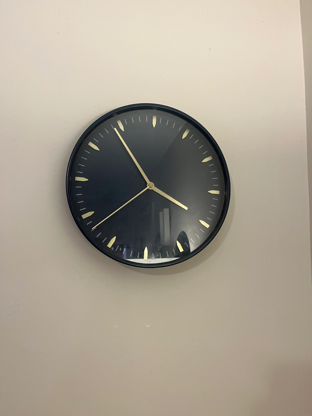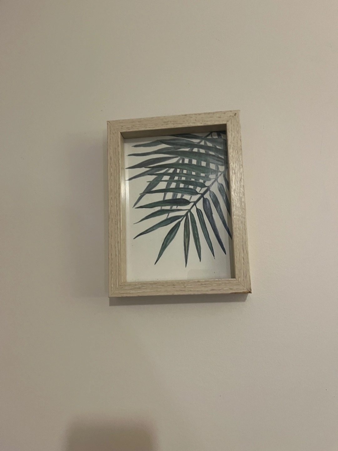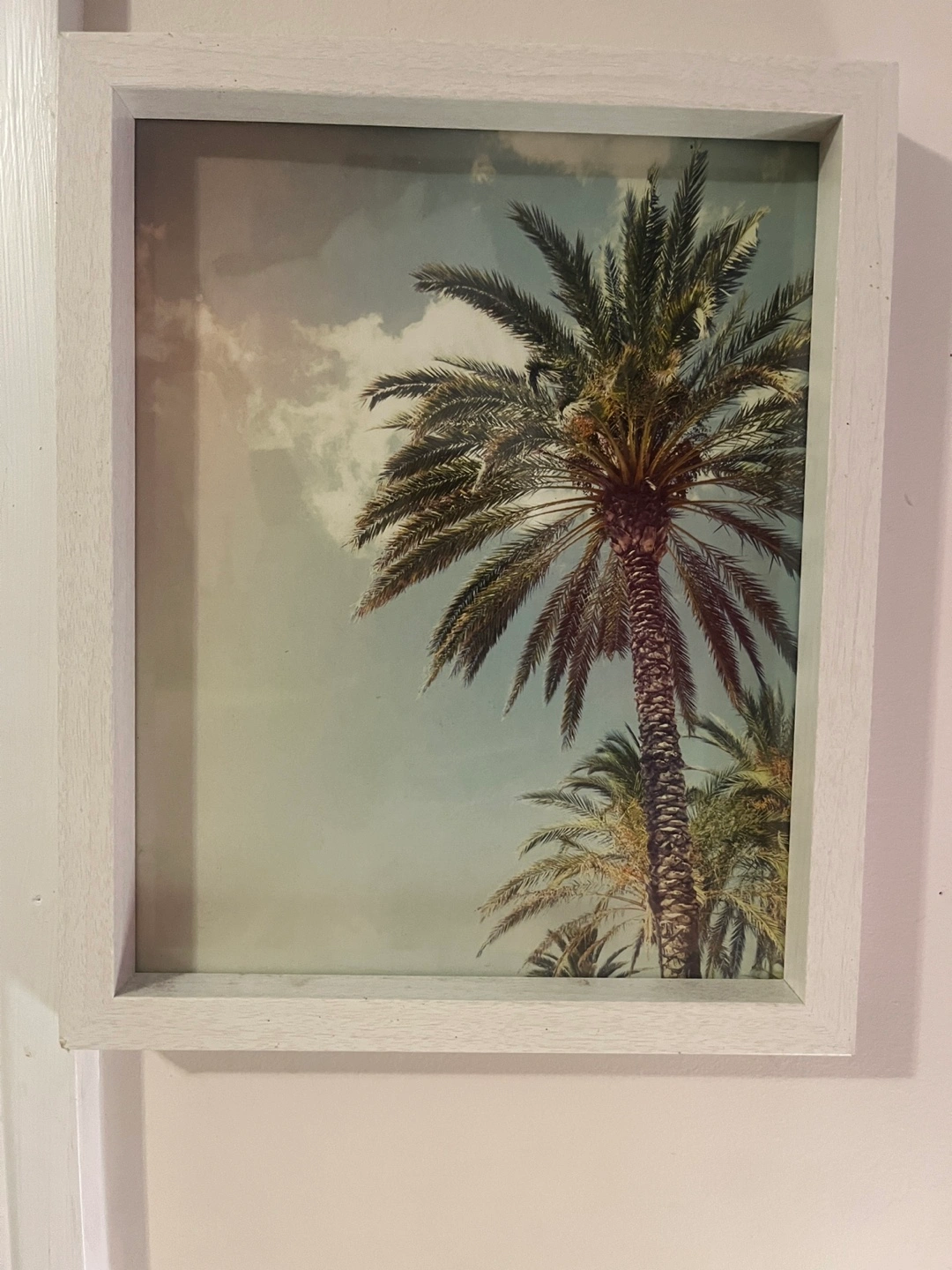 Set of three framed prints, two palm tree designs, one featuring a single palm leaf. White and light wood frames. One navy blue wall clock, gold hands. Great for home decor.