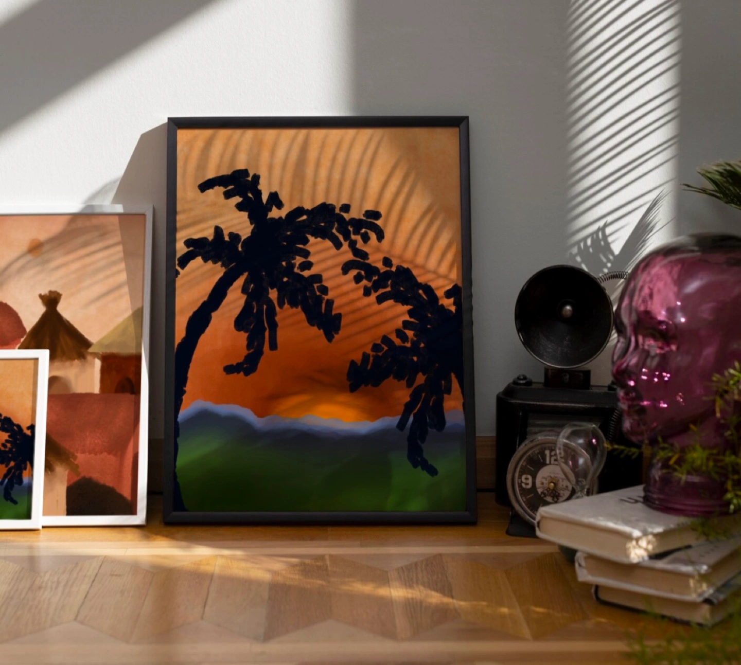 Beautiful framed art print. Depicts a sunset scene with palm trees. Black frame. Perfect for home décor. Size is 11 x 14 There is also 12 x 16 option which is $48 Check out more of our listings to see more unique wall art Firm price no negotiation