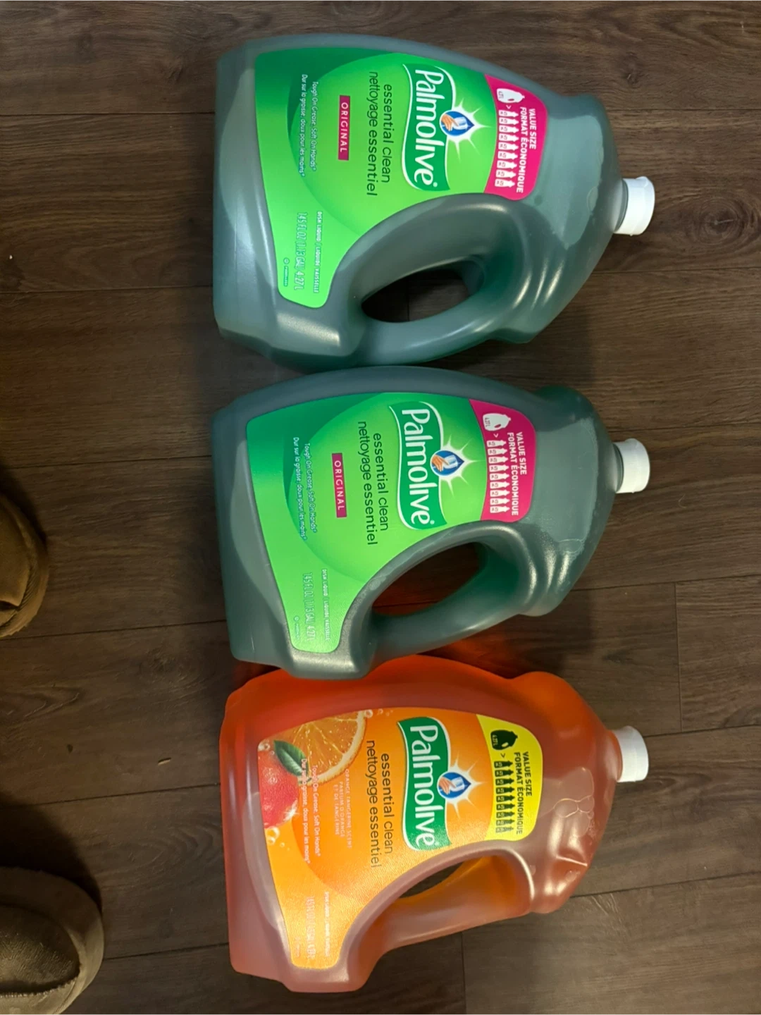 I'm selling Palmolive Essential Clean dish soap in the value size (4.27L). There are two bottles of the original scent and one bottle of the orange scent available! $9 each