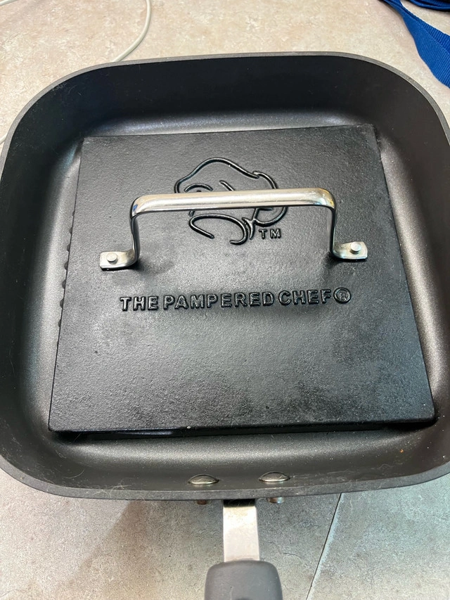 15This is a Pampered Chef grill pan that has been well-loved and ready to grill up some tasty meals! It’s perfect for indoor grilling and adds a touch of flavour to any meal. * Brand: Pampered Chef * Type: Grill Pan and Press * Material: Durable non-stick * Features: Ridged