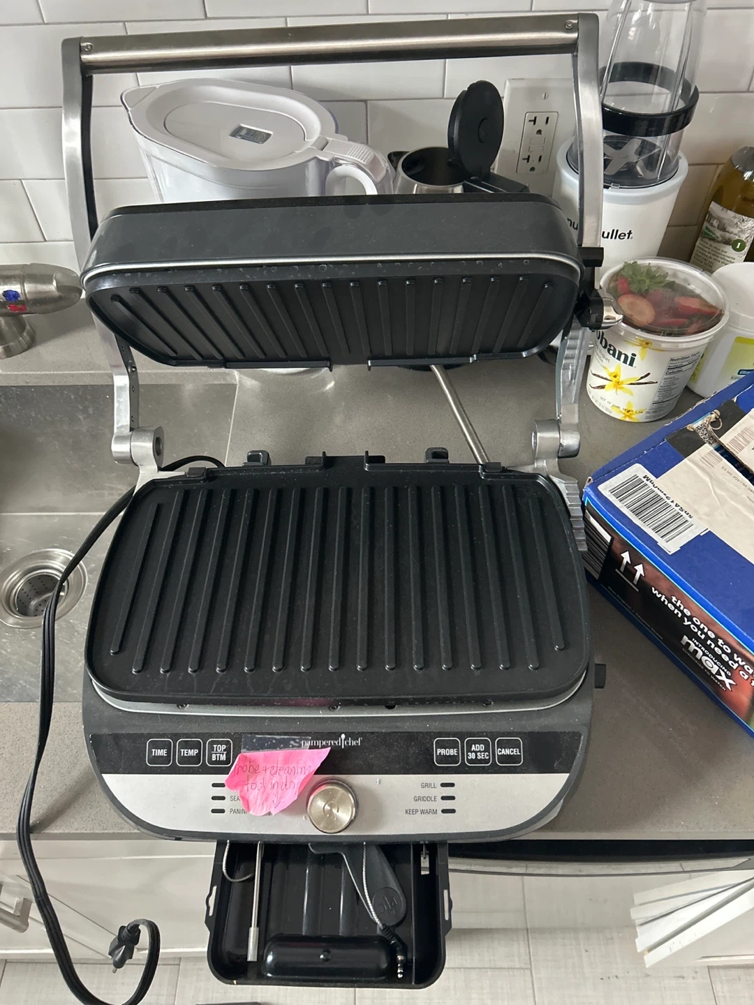 Selling a Pampered Chef grill and panini maker. It has settings for grill, griddle, and keep warm. Also includes a probe!